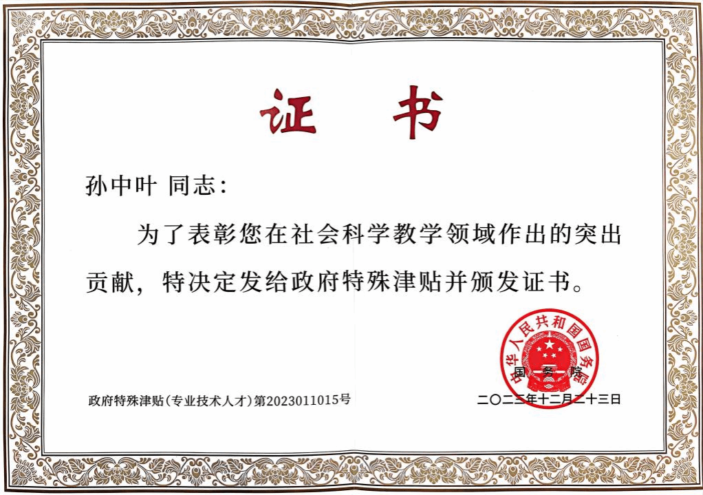 孙中叶教授获评国务院政府特殊津贴专家