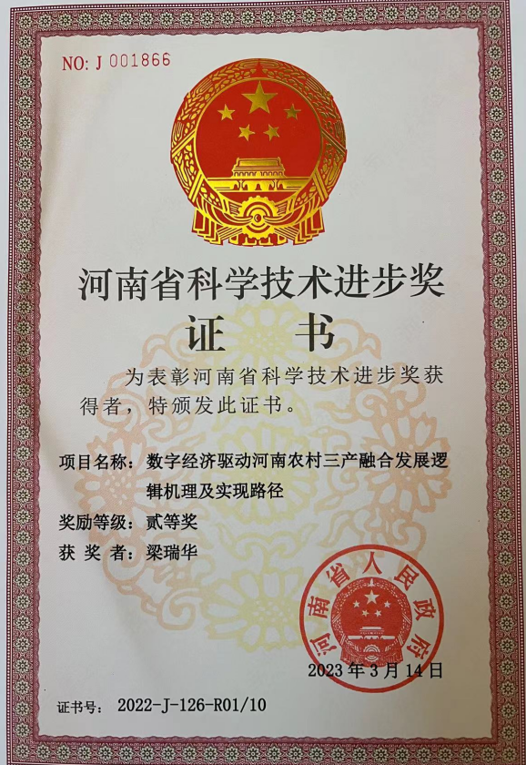 研究成果《数字经济驱动河南农村三产融合发展逻机理及实现路径》获河南省科技进步奖二等奖