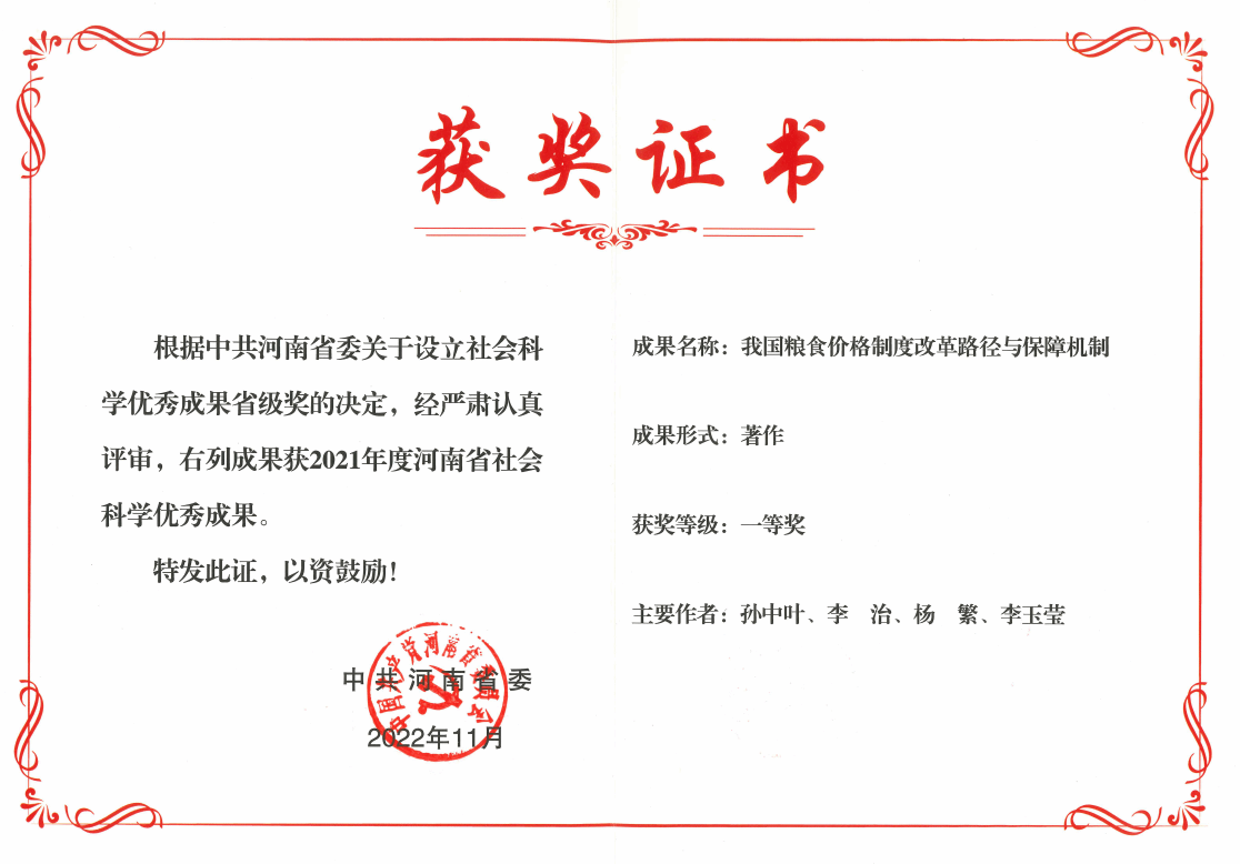 著作《我国粮食价格制度改革路径与保障机制》获河南省社科优秀成果奖一等奖