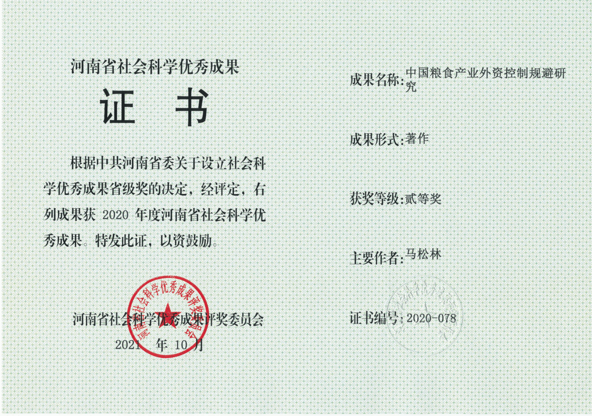 著作《中国粮食产业外资控制规避研究》获河南省社科优秀成果奖二等奖