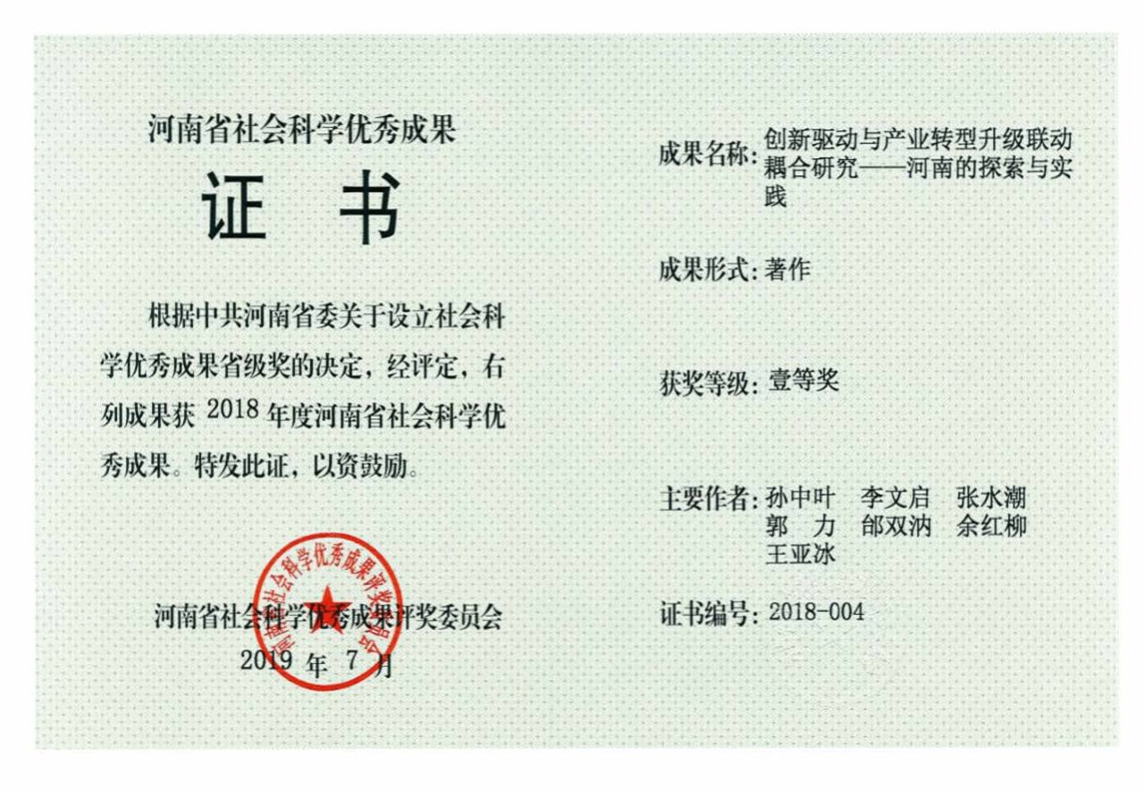 著作《创新驱动与产业转型升级联动耦合研究——河南的探索与实践》获河南省社科优秀成果奖一等奖