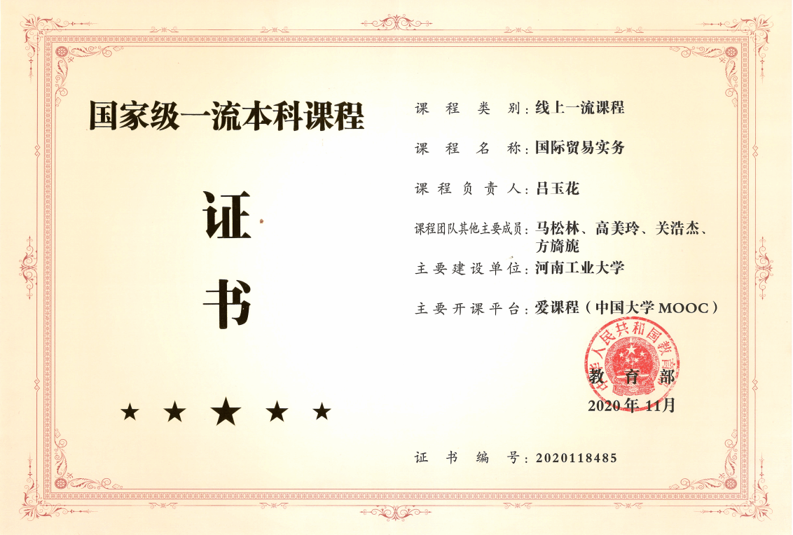 《国际贸易实务》国家级一流本科课程证书