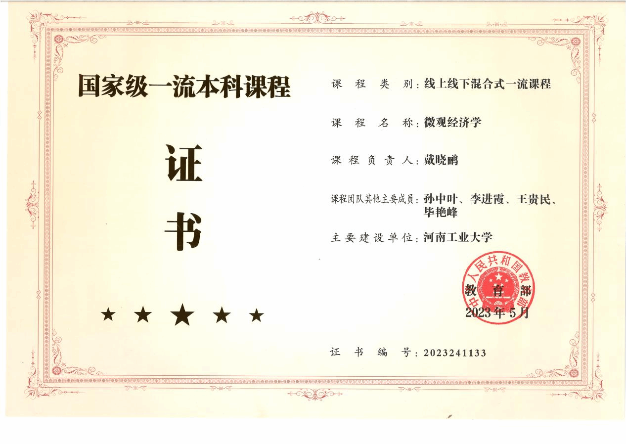 《微观经济学》国家级一流本科课程证书