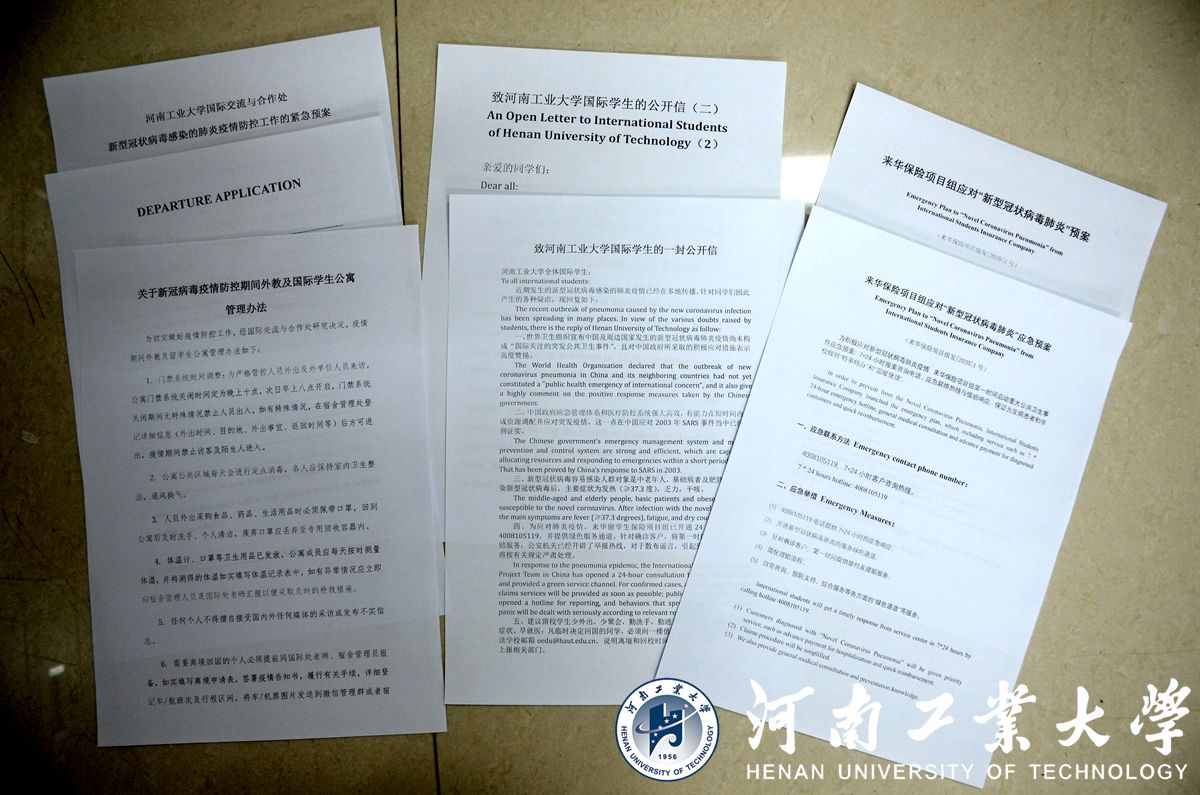 随着习近平总书记向全党全国发出打赢疫情防控阻击战的战斗号召,我省启动重大突发公共卫生事件一级响应。根据《教育部关于切实做好新型冠状病毒感染的肺炎疫情防控工作的通知》、《教育厅关于做好乐鱼online(中国)新型冠状病毒感染的肺炎疫情防控工作的紧急通知》和《河南工业大学新型冠状病毒感染的肺炎疫情防控工作方案》要求,结合我校党委疫情防控部署安排,国际交流与合作处迅速响应成立疫情防控工作领导小组,制定《河南工业大学国际交流与合作处新型冠状病毒感染的肺炎疫情防控工作的紧急预案》,建立外教留学生防控群,全体人员以强烈的责任担当,坚守岗位,建立疫情信息上报机制、开展宣传引导安抚工作,全力做好新型冠状病毒感染肺炎防控工作。