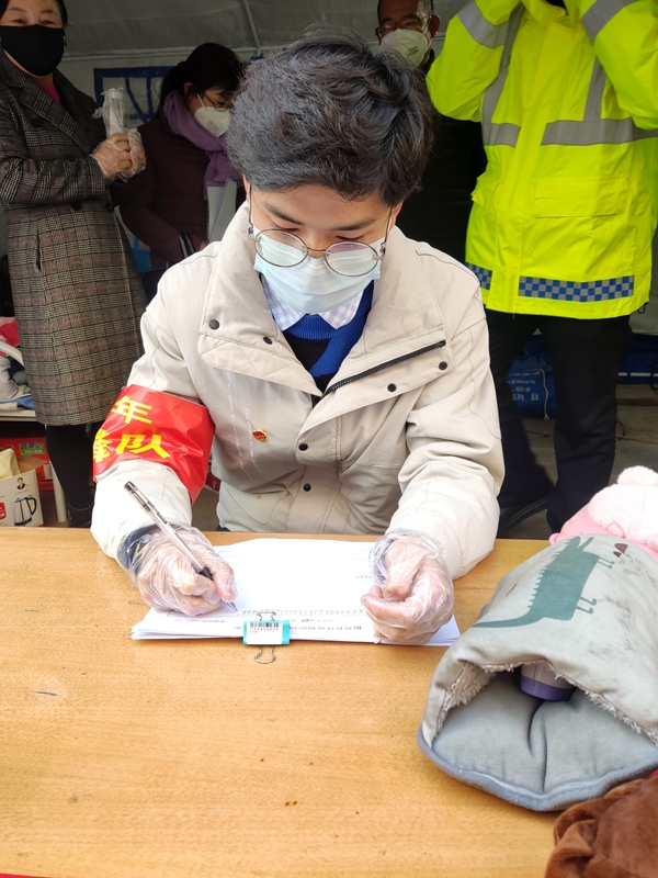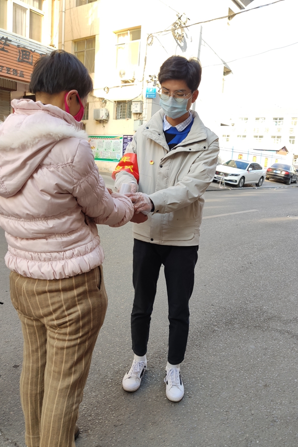 由于第三天下午封闭路口被用彩钢板彻底封堵,从第四天开始,我来到了社区的一个可通行路口的体温监测点,这个路口由于是为数不多的可以进入社区的道路之一,所以通行量比较大,我的服务内容也就变更成为了为过往的人群测量体温,在来来往往形形色色的行人中,或许下一个人就会是新冠肺炎患者的密切接触者,但是我们没有退缩,在积极做好防护措施的同时为每一位行人进行精准的体温测量和车辆的来往登记。由于气温较低,我们所使用的红外体温计除了一用一消毒之外,还要在体温计暂时不用的情况下用手捂热体温计,不然测量的过程中就会出现较大的误差。这里的条件比较艰苦,气温比较低,我们只能用取暖器取暖,没有吃饭的地方,只能自己烧水吃泡面。在我志愿服务的第六天,团县委为我们青年志愿者统配发了共青团团徽,要求我们在志愿服务时佩戴在身上,当我佩戴上团徽的时候,我更加意识到了共青团员发扬社会主义新风尚,积极参加志愿服务,实践社会主义核心价值观和社会主义荣辱观的这一义务,由于个人的原因,我在第一学期并没有参加入党积极分子的评选,而下次我会积极参与,争取能成为一名光荣的共产党员。