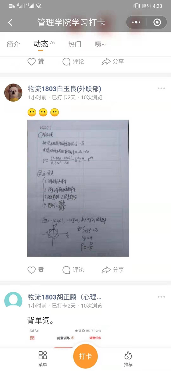 校团委按照乐鱼online(中国)延期开学期间的工作方案,结合现实情况,积极开展了“线上打卡”学风建设活动。以团支部为单位,开展居家线上“德、智、体、美、劳”打卡活动,倡导支部团员做到“停课不停学,学习不延期”,科学合理做好假期延长期间的规划,全面提升综合素质。例如,德育打卡:利用学习强国APP、专题网站、共青团公众号等资源进行;智育打卡:引导青年学生读好书、好读书,组织读书打卡,利用英语学习APP、观看英文电影、四六级、考研英语复习等英语打卡,通过网课、习题、讨论,开展数学及其他课程学习打卡,通过办公软件、专业软件学习,开展计算机技能打卡等;体育打卡:进行居家健身(俯卧撑、仰卧起坐、跳绳、瑜伽等形式);美育打卡:书法、绘画、乐器练习等形式;劳育打卡:做饭、扫地、整理房间等形式。各支部通过建立支部学习交流群、打卡群的方式督促、记录团员个人学习计划完成进度,假期结束后以自评或互评的方式验收成果。