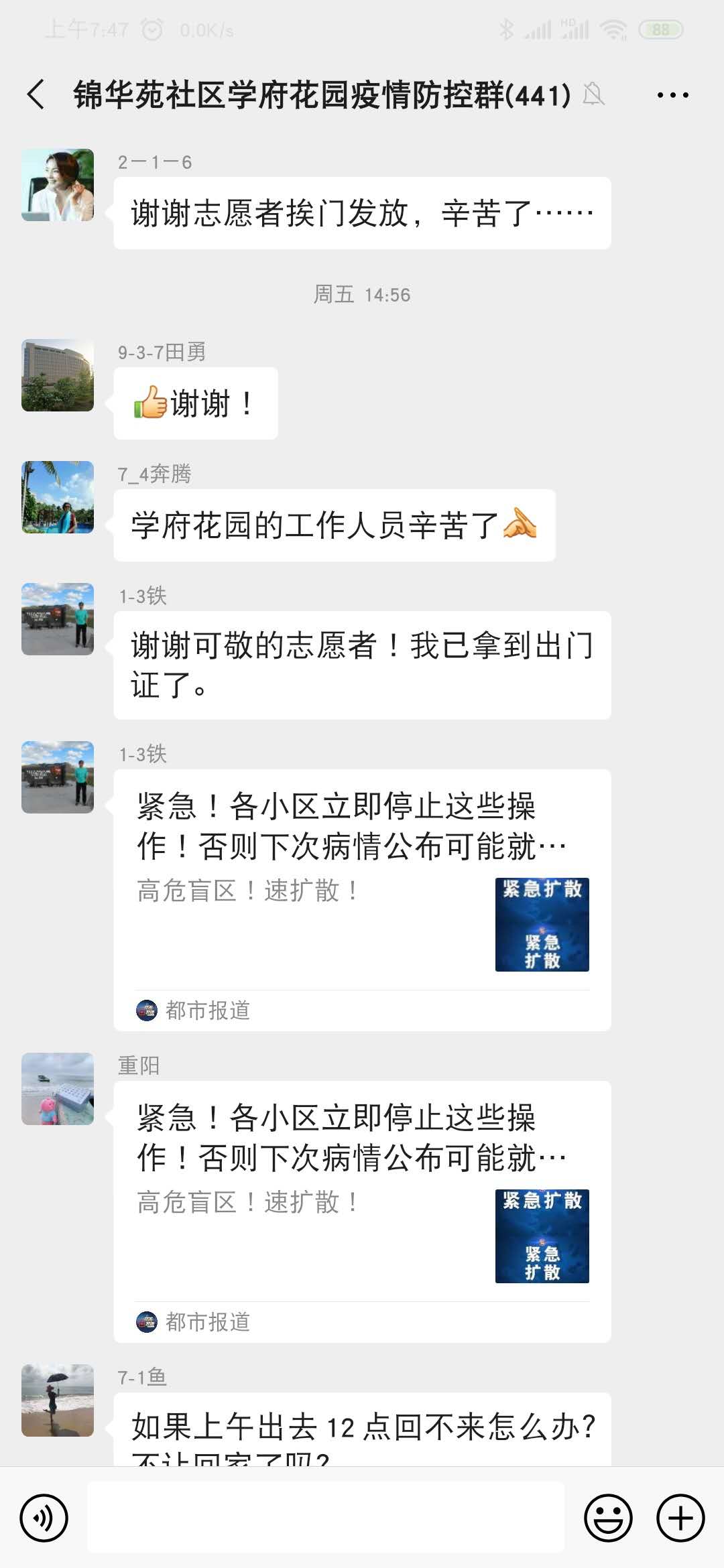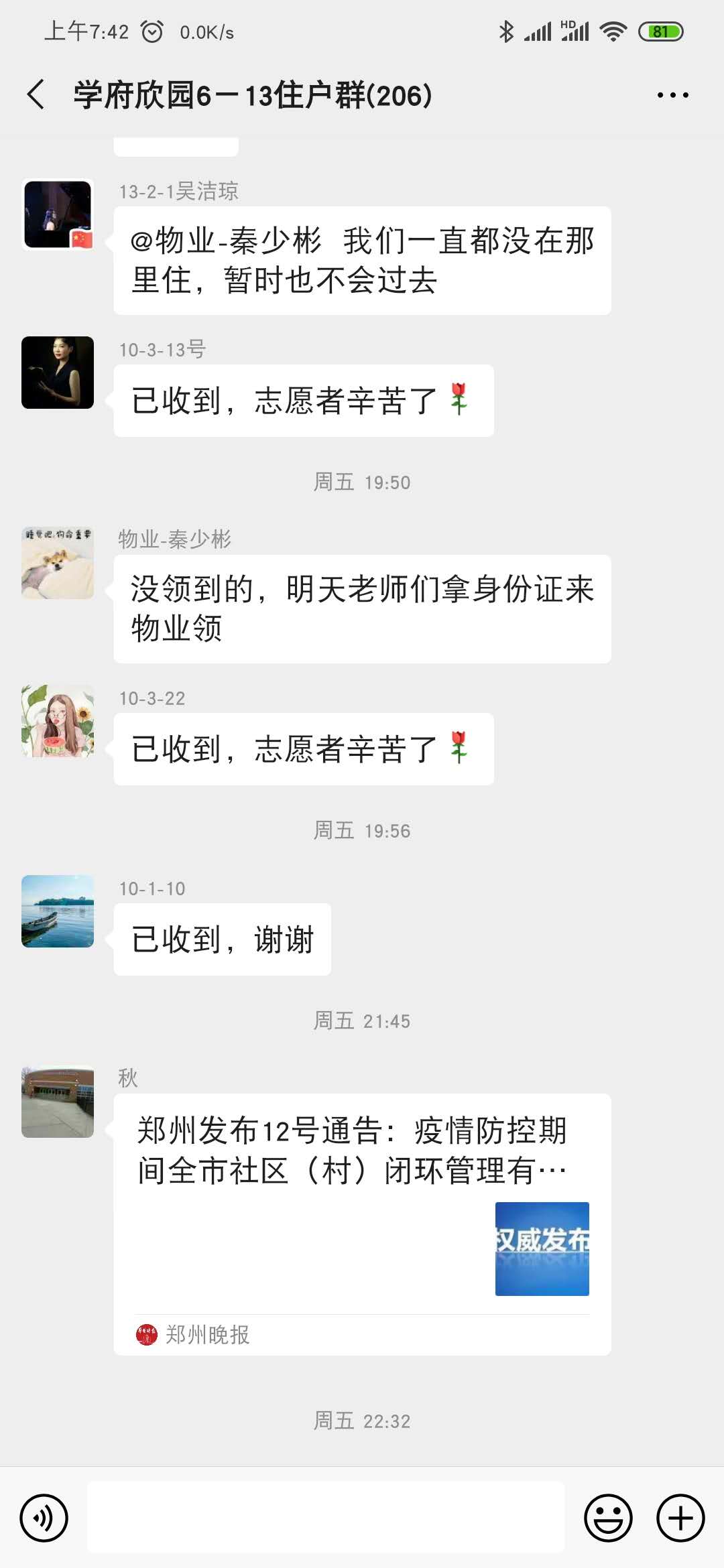 对于志愿者的行动,广大住户纷纷通过微信表达自己的感激之情,说的最多的是“已收到,志愿者辛苦了”,“已收到,谢谢”。乐鱼online(中国)的领导干部带头当志愿者更是令教师们感动。学府欣园6号楼1单元16号住户留言:“我们楼志愿者是张石张主任(校招生办主任),咱们的处级干部领导来当志愿者,感动、感谢了。辛苦啦志愿者们”;7号楼1单元21号住户留言:“7号楼志愿者是研究生院副院长薛中海副院长,辛苦了!”13号楼1单元16号住户留言:“13号楼志愿者是赵强主任(校友办副主任),都是处级干部,暖心”,另一个老师说到:“是啊,今天领的出入卡就是赵强主任上门给的”。