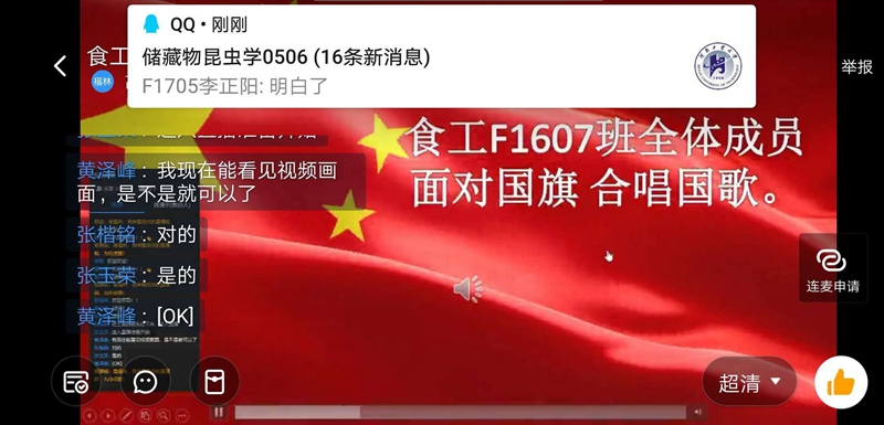 2016级食品科学与工程专业F1607班班主任张玉荣老师利用钉钉进行视频直播,在班会议程中,增加“凝视国旗,齐唱国歌”环节,从会议开始就培养学生的爱国情怀。在班会进行过程中,张老师邀请学工部部长黄泽峰进入直播间,受到广大学生的热烈欢迎。2018级食品科学与工程专业F1801班班主任王远辉老师,选取疫情防控志愿者逯艳超同学线上发言,讲解志愿服务工作中的所见所闻与疫情防控相关知识,以个人实际经历鼓励广大学生坚定信心,振奋精神,共同打赢疫情防控阻击战。外语学院英语1903班的班会不仅选用了大量图片,还通过播放本班级制作的视频向同学们传递感动的故事和精彩瞬间。经济贸易学院经济1602班王松梅老师、财政1802班李小珍老师、金融1801班李振宇老师、经济1703王秋瑾等多位老师采用QQ直播的方式开展网络会议,在直播间与同学们积极互动,调动同学们的参与度。老师们还制作了精美的PPT,将“QQ直播间”和“屏幕分享”相结合,鼓励同学们尽快适应新的网络教学新模式,达到在家也能自主高效学习的目标。辅导员们借助网络班会对学生开展群体心理辅导,缓解学生焦虑情绪,帮助大家从容面对不良情绪。机电工程学院在网络班会中通过组织学习诸多感人肺腑的抗疫先进人物事迹。使同学们增强向模范学习意识,勇于肩负起时代赋予的使命与责任,与祖国同命运,与人民共患难,为打赢疫情防控阻击战作出应有的贡献。