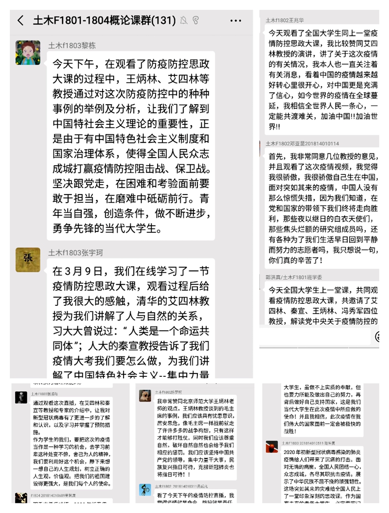 同学们观看视频以后纷纷表示,要用自己的实际行动践行爱国主义思想,在学习中加强自身修养、提高精神境界,在实践中了解国情、经受锻炼、增长才干。土木工程学院2018级学生黎栋、张宇珂等学生在线展开了热烈的讨论。通过观看这次视频直播,同学们不仅对新型冠状病毒有了更清楚的认识,了解到正是由于中国特色社会主义制度和国家治理体系,才能使得全国人民团结一致,众志成城打赢这场疫情阻击战、保卫战。坚定信心跟党走,在困难和灾难面前彰显当代青年的作为与担当,在磨砺中砥砺前行。青年当自强,创造条件,不断进步,争做勇登先锋的当代大学生。通过王炳林教授讲解当年毛主席的事例,同学们意识到平常生活中要有忧患意识,要学会尊重自然,做到人与自然和平相处,不然会受到自然的惩罚,坚决坚持共产党的领导,集中力量干大事,攻克新型冠状疫情指日可待!中华民族伟大复兴指日可待!