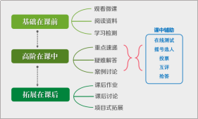 按照单元教学目标的高低阶层次,将对应的教学内容分为基础模块和高阶模块。基础模块内容安排在课前学习,以微课为主。高阶模块内容服务于高阶思维及综合能力培养,在课中进行,通过案例分析、讨论等互动学习促使学生深度思考、完成知识内化。课后增加学科知识及能力拓展内容,以小组互助学习为主。