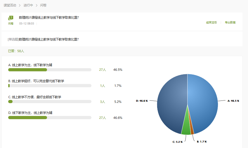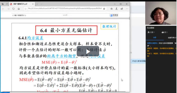 数理统计课程原采用线上线下混合式教学,本学期因疫情原因,学生居家时采用线上教学,学生返校后如果条件允许,采用线上线下混合式教学。