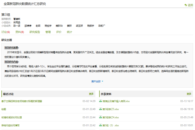 3.理论实践结合,培养学生创新思维。结合统计软件,从实际案例着手进行分析推断,如设计PBL项目《全国新冠肺炎数据统计汇总研究》,引导学生参与数学建模竞赛等科技创新活动,使学生通过努力获得成就感,实现课程挑战度。