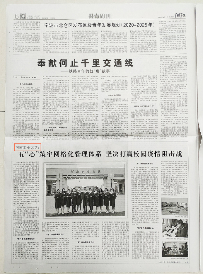 中央媒体《中国青年报》4月9日刊第6版,以“河南工业大学:五‘心’筑牢网格化管理体系 坚决打赢校园疫情阻击战”为题报道我校抗击疫情工作。报道链接:http://mzqb.cyol.com/html/2020-04/09/content_283553.htm?from=singlemessage