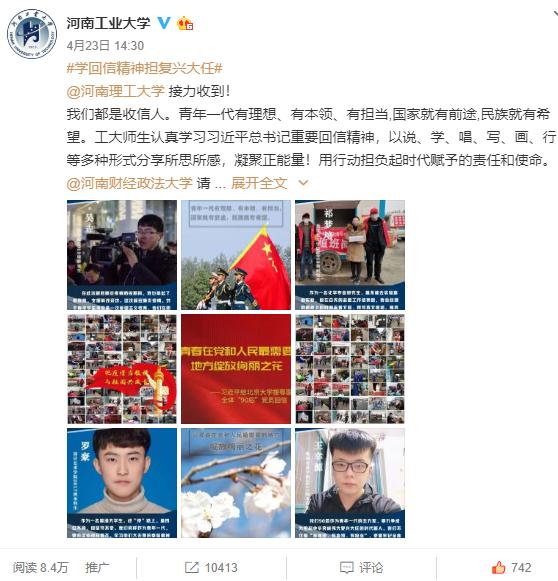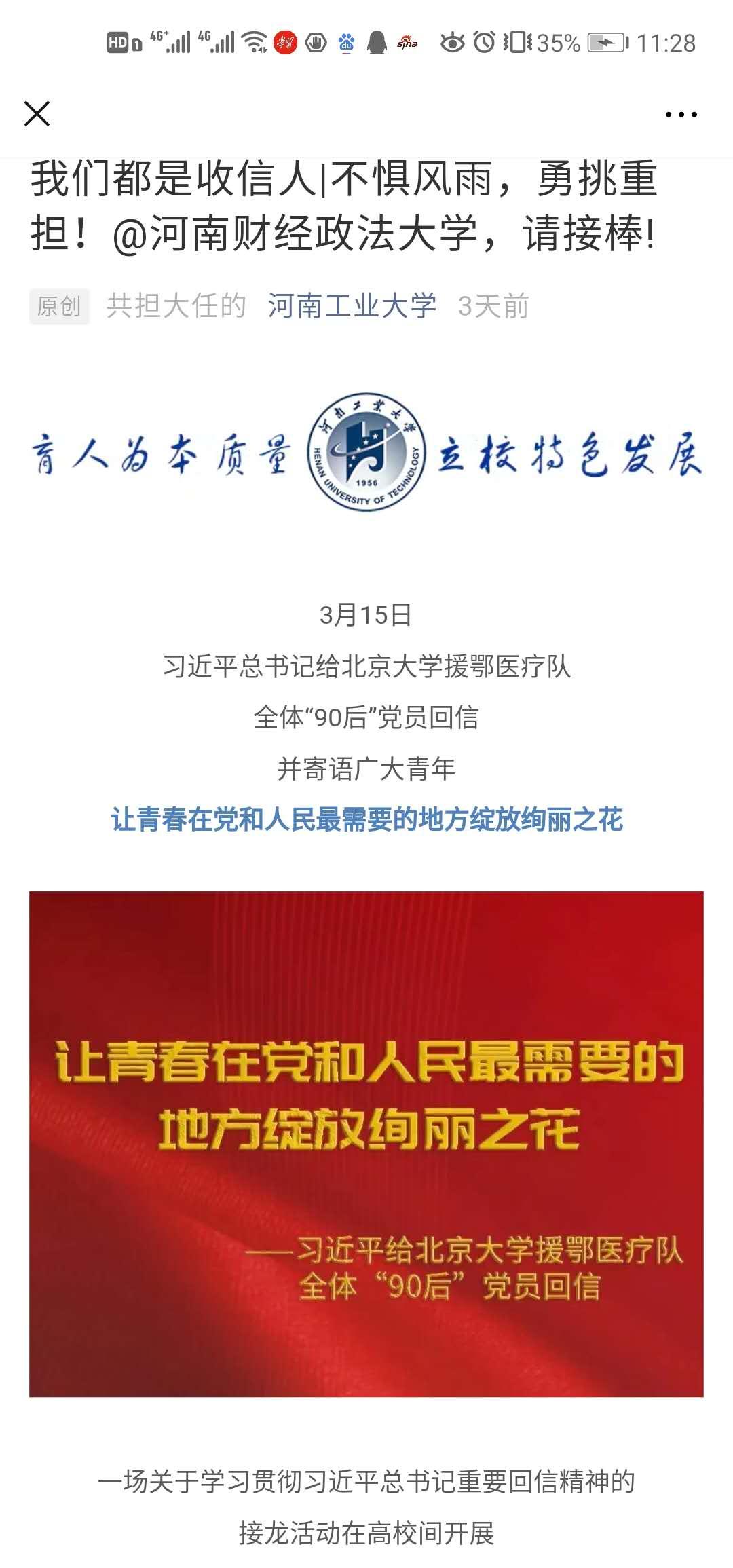 自线上接力开展以来,乐鱼online(中国)微信推文《我们都是收信人|不惧风雨,勇挑重担!@河南财经政法大学,请接棒!》阅读量已突破5万,乐鱼online(中国)#学回信精神担复兴大任#接龙微博阅读量突破8万。根据工作安排,下一步乐鱼online(中国)还将结合学习回信精神,在校内继续开展“把灾难当教材 与祖国共成长”学院官微“@大接龙”活动,保证疫情防控期间,对乐鱼online(中国)师生的思想引领不缺席,引导广大师生将回信精神落实到为人民服务的工作和学习中去,让青春在党和人民最需要的地方绽放绚丽之花。