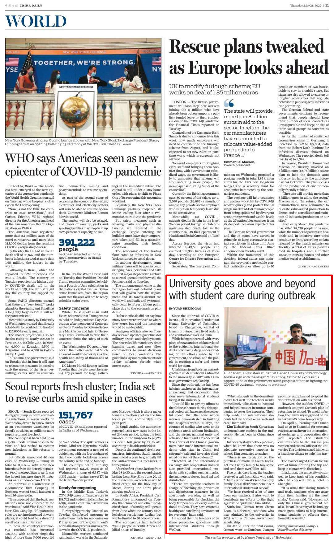 5月28日,《中国日报》国际版以University goes above and beyond with student care during outbreak为题,报道了我校在疫情防控期间对外国留学生有序管理和无私关爱的突出成绩。