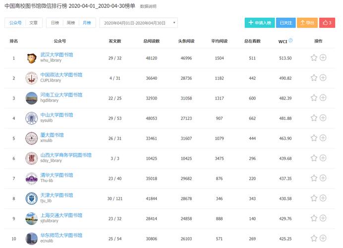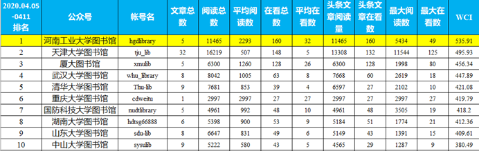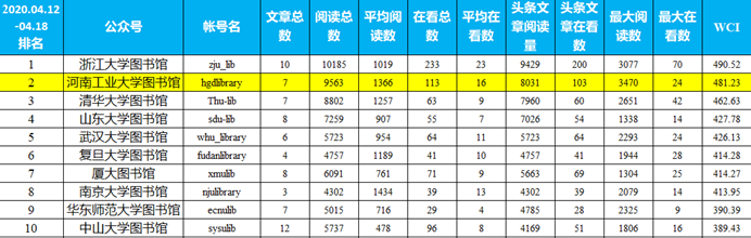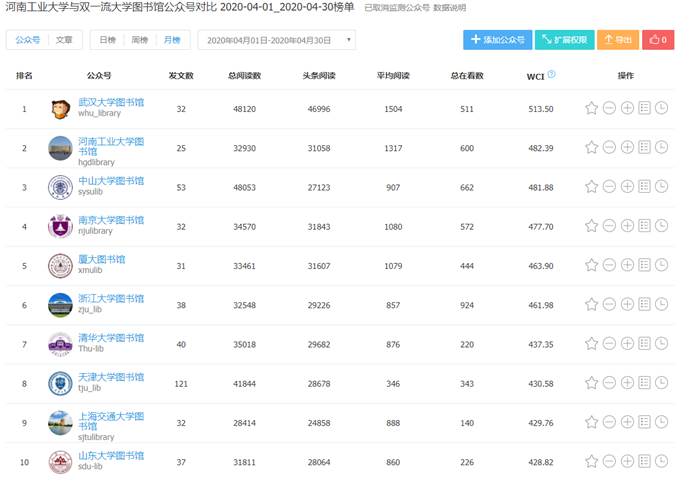 2020年新冠疫情突发,我校图书馆充分利用新媒体平台做好图书馆各项文献资源宣传工作,四月份共发布25篇文章,阅读总数32930,WCI482.39。疫情期间从1月22日至今,河南工业大学新媒体微信平台共发布了70篇推文,清博大数据指数统计阅读总数达到十万人次,头条文章阅读量达到11465人次,较之全国双一流高校图书馆新媒体平台影响力也毫不逊色。充分说明我校图书馆新媒体平台的较强实力及影响力!