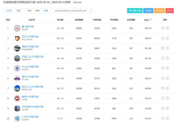 据2020年6月“清博大数据”发布的中国高校图书馆微信排行榜中,河南工业大学图书馆微信公众号在2020年4月5月全国495家中国高校图书馆微信排行榜中曾位列周榜单排名第一、月榜单排名第三、第四好成绩,与42所双一流大学图书馆公众号对比排名中位列第二。
