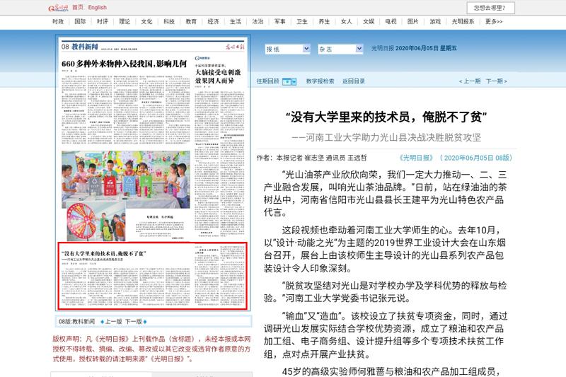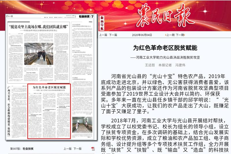 6月初,中央媒体《光明日报》和《农民日报》分别以《“没有大学里来的技术员,俺脱不了贫”——河南工业大学助力光山县决战决胜脱贫攻坚》和《用科技为红色革命老区脱贫赋能 ——河南工业大学助力光山县决战决胜脱贫攻坚纪实》为题报道了我校结对帮扶河南省光山县扶贫工作开展情况和取得的成绩。