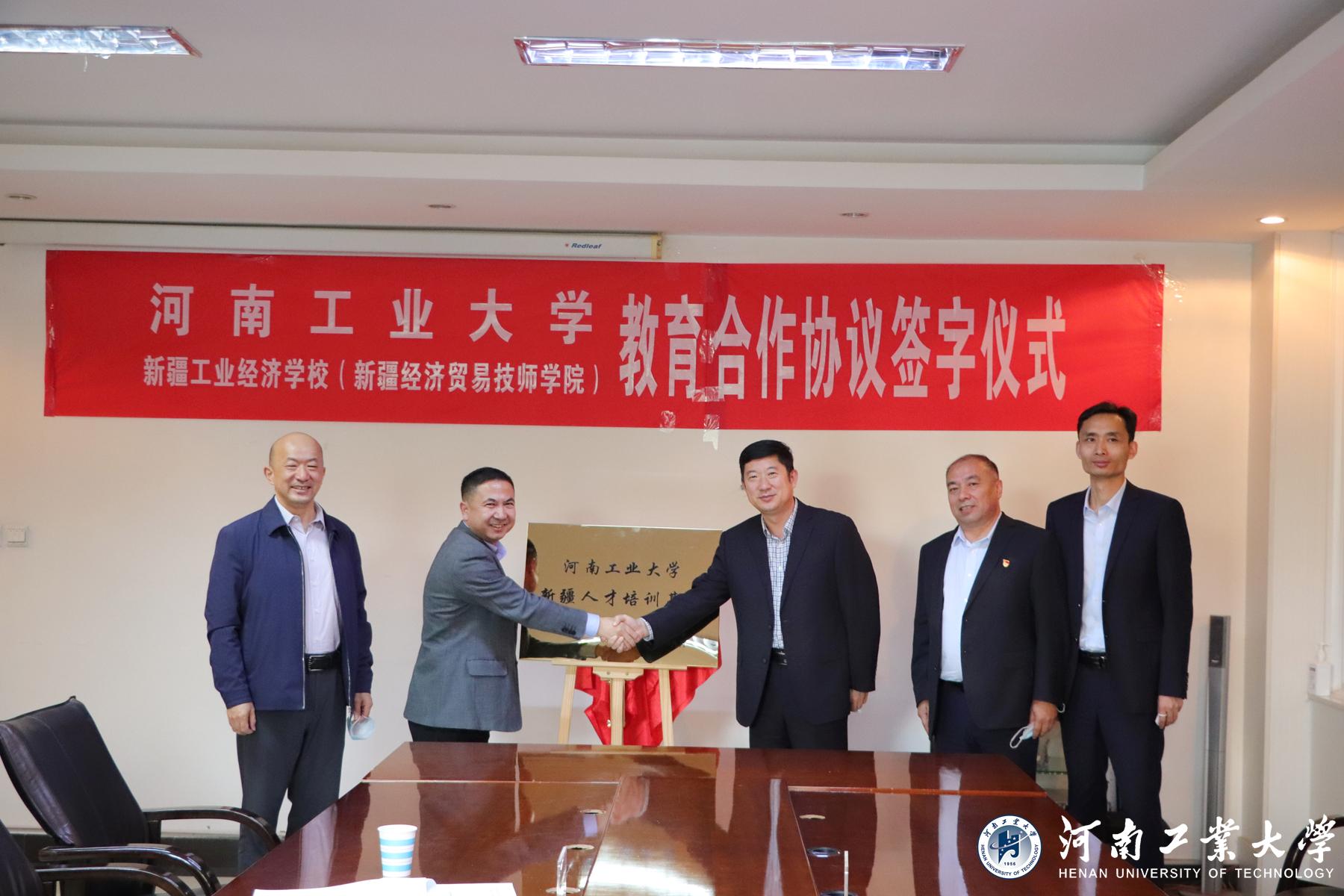 为认真贯彻习近平新时代中国特色社会主义思想和中央治疆方略,深入落实河南省委、省政府新一轮对口援疆要求,充分发挥乐鱼online(中国)在粮食行业的办学特色与优势,进一步助力边疆教育发展,加强豫疆两地院校合作交流。9月23日下午,河南工业大学与新疆工业经济乐鱼online(中国)(新疆经济贸易技师学院)教育合作协议签字仪式在新疆工业经济乐鱼online(中国)如期举行,“河南工业大学新疆人才培训基地”在签字仪式上正式揭牌。副校长李焕锋,远程与继续教育学院院长刘克非,标准化与质量检测中心主任王殿轩,信息科学与工程学院计算中心主任肖乐,新疆维吾尔自治区粮食和物资储备局党委委员、副局长马雪渊,新疆工业经济乐鱼online(中国)领导班子成员与相关系部处室负责人参加了签约揭牌仪式。