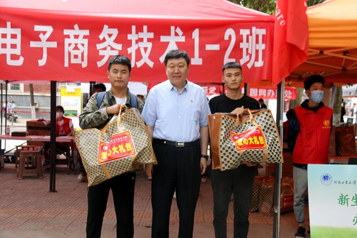 在嵩山路校区东大门,大数据技术及应用、电子商务技术专业的新同学正有序入校,在志愿者的热情服务下,证件查验、体温检测、行李消杀、行李接送等工作有条不紊。张元要求学院认真做好疫情防控和迎新服务工作,把师生健康放在第一位。在新生报到现场,张元向家庭经济困难学生送上爱心礼包,并与新生亲切交流,勉励新同学要做好大学规划,精进学业,增长才干。
