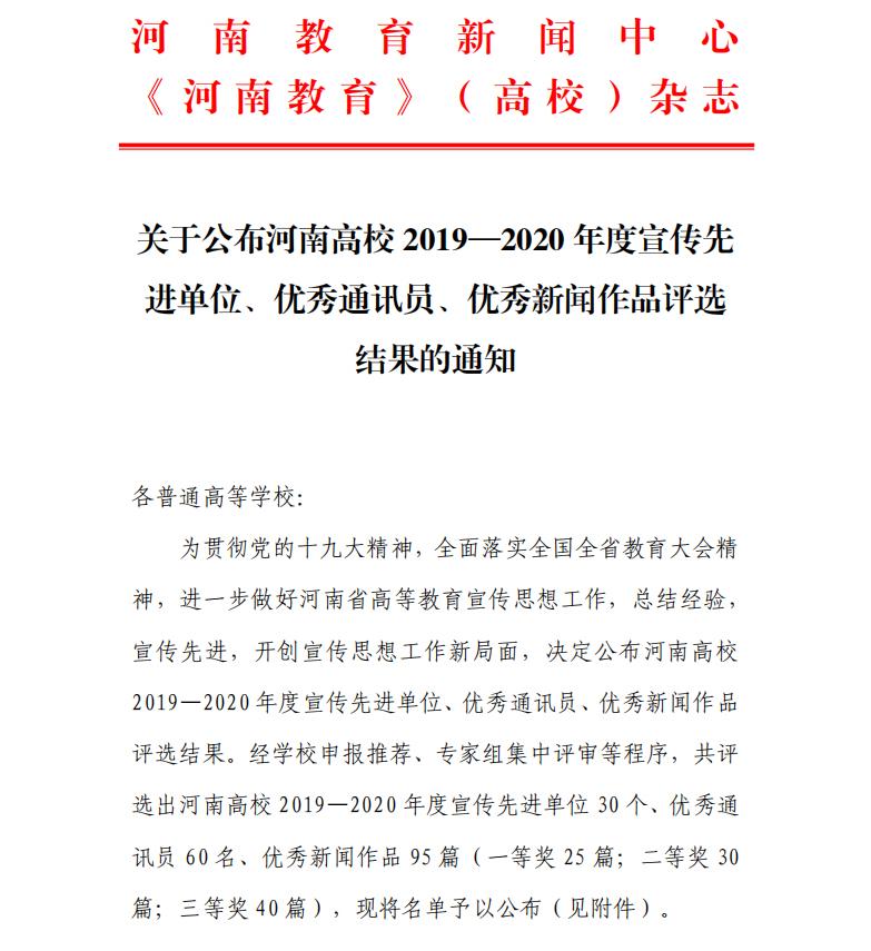 近日,由河南教育新闻中心、《河南教育》(高校)杂志共同发起的河南高校2019—2020年度宣传先进单位、优秀通讯员、优秀新闻作品评选活动结果揭晓,我校获得多项荣誉。