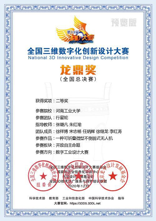 近日,由全国三维数字化技术推广服务与教育培训联盟(3D动力)发起举办,由国家科技部、工信部、教育部、中国科协等部门指导的第十三届全国数字化创新设计大赛全国总决赛落下帷幕。机电工程学院由张璐凡、朱红瑜两位老师指导,徐祥博、宋志杨、任炳辉、徐继龙、李洪涛等五位学生参加的作品“一种可折叠不倒翁式无人机”斩获全国二等奖。