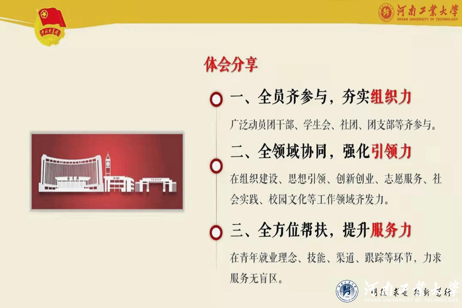 我校在会上谈到,青年就业是“六稳”“六保”工作重中之重。我校认真贯彻落实团中央、团省委服务青年就业要求,构建思想政治引领、团干部人文引领、青年朋辈引领三大引领工作布局,围绕学生成长成才一条主线,突出提升就业技能、扩展就业渠道两个重点,完善跟踪服务、同辈就业帮扶、创业带动就业三大机制,强化精准服务,实现青年就业。最后,她总结了三点工作体会:一是全员参与,夯实组织力。广泛动员全体团干部、学生会、社团、团支部等齐参与;二是全领域协同,强化引领力。在组织建设、思想引领、创新创业、志愿服务、社会实践、校园文化等工作领域齐发力;三是全方位帮扶,提升服务力。在青年就业理念、技能、渠道、跟踪等环节,做到服务无盲区。
