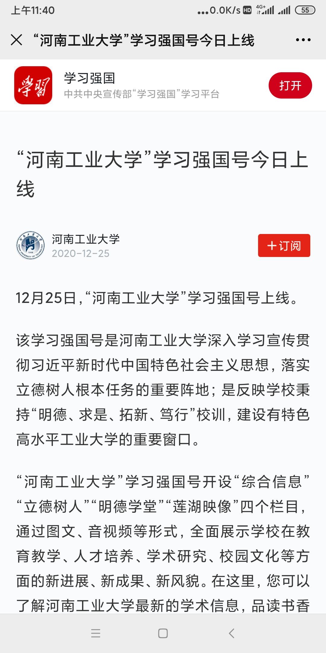 12月25日,“河南工业大学”强国号正式上线运行。