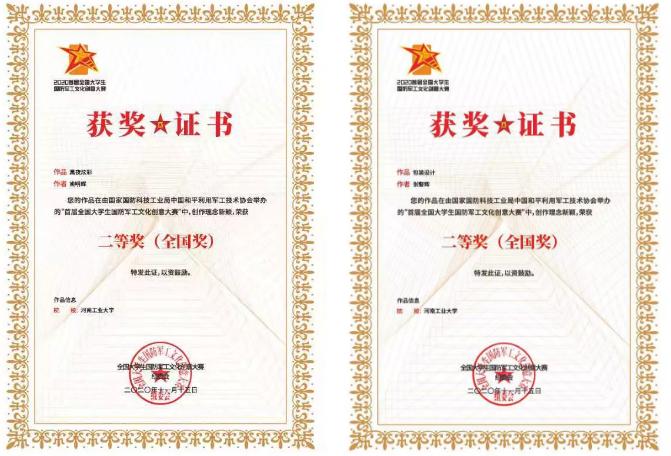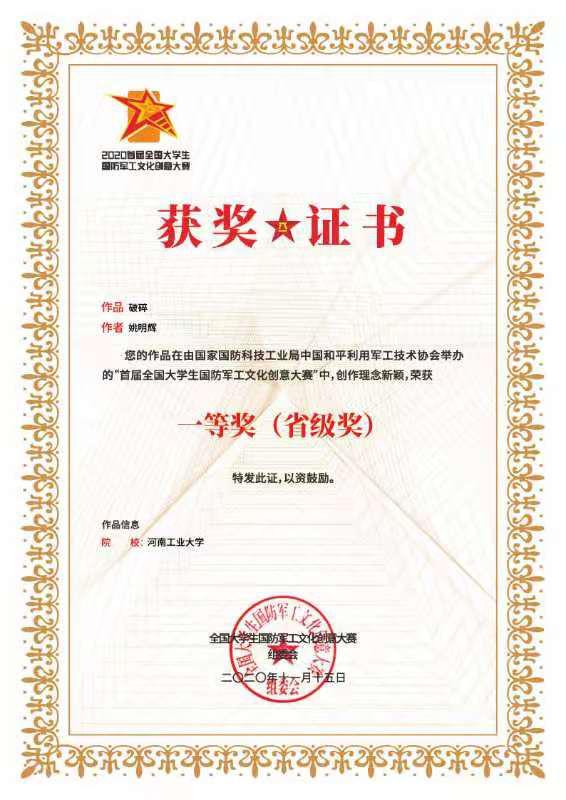 近日,2020首届全国大学生国防军工文化创意大赛结果揭晓,漯河工学院视觉传达与设计专业姚明辉同学的作品《黑夜炫彩》、张警辉同学的作品《包装设计》双双荣获全国二等奖,姚明辉同学的另一幅参赛作品《破碎》荣获全省一等奖。