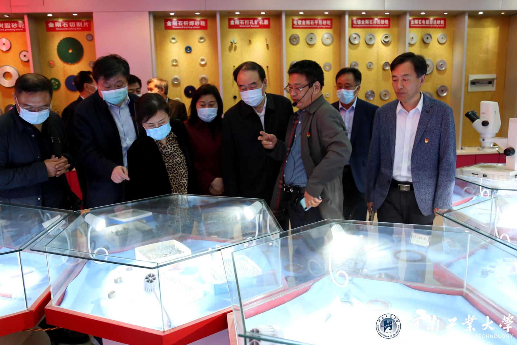 检查组一行首先来到材料科学与工程学院成果展示室,认真听取了材料科学与工程学院院长徐三魁就我校超硬材料学科科技创新及服务经济社会发展等情况汇报。河南省作为超硬材料与磨料磨具的产业基地,金刚石的产量超过世界总产量的80%以上,材料科学与工程学院和国际领先的黄河旋风、中南钻石等制造企业,以及郑州磨料磨具与磨削研究所等进行产学研全方位合作,通过科研项目合作等方式与各企业共同开发,解决国内高端装备制造业难点问题。例如我校和郑州富士康开展手机玻璃的精密磨削砂盘,解决了新一代微晶玻璃的表面磨削问题;通过和郑州市钻石精密制造有限公司解决汽车零部件精密切削加工,实现了以车代磨;和郑州三磨所开展的IC芯片、单晶硅的超精密磨削项目,解决了国内该领域的卡脖子工程。