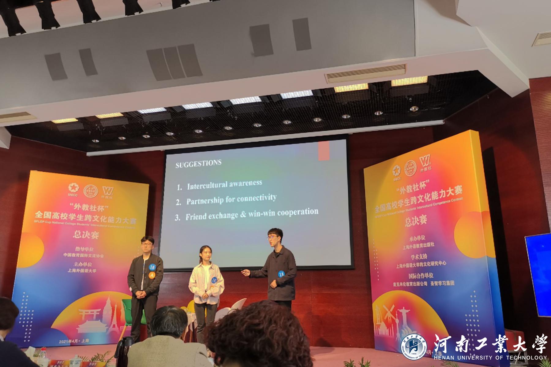 4月25日,由中国教育国际交流协会主办、上海外国语大学协办、上海外语教育出版社承办的2021“外教社杯”全国高校学生跨文化能力大赛总决赛暨颁奖典礼圆满落幕。我校英语专业的赵鹏和食品科学与工程专业的马泽、孙晗三位同学所组成的代表队斩获三等奖。