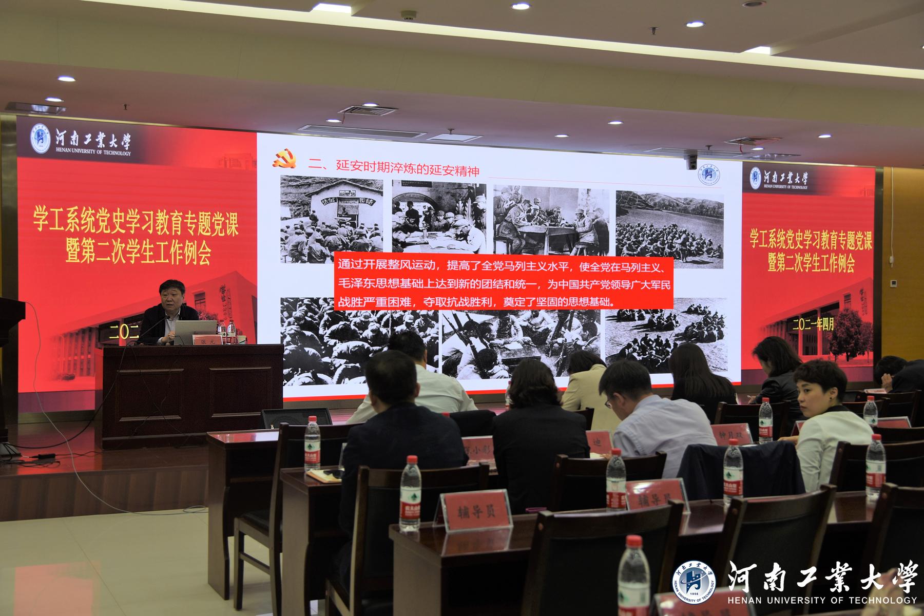 为进一步推动党史学习教育深入开展,传承红色基因,坚定理想信念,4月29日,学工系统党史学习教育专题党课暨第二次学生工作例会在学术报告中心D205报告厅举行,校党委书记张元以《延安精神垂青史,实事求是拓新程》为题讲授专题党课。学生工作领导小组成员单位相关负责同志,各学院党委副书记及全体辅导员,学工部、就业创业中心、校团委全体工作人员,青马星火团、国防预备役学生参加了此次党课学习。会议由学工部部长黄泽峰主持。
