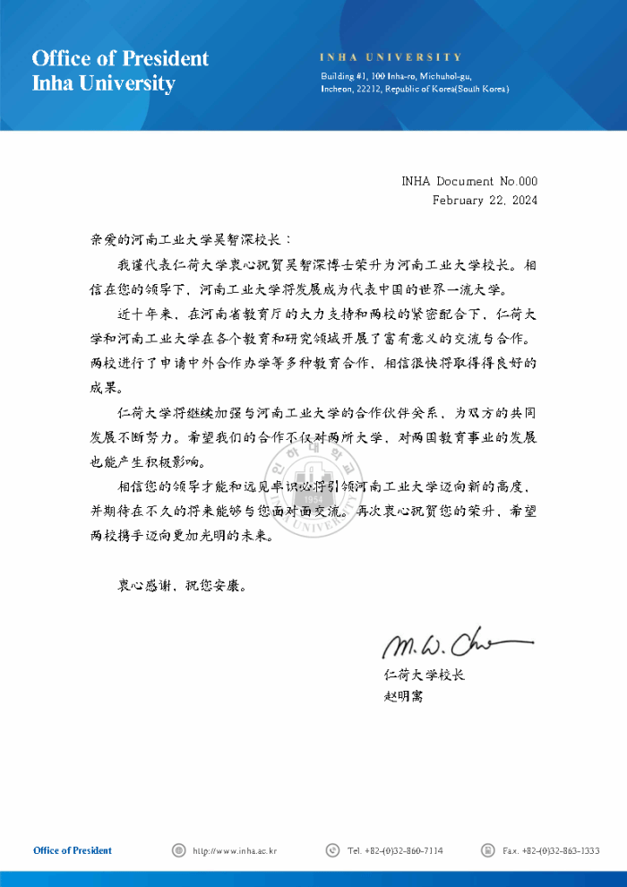 近日,韩国仁荷大学赵明寓校长向我校发来贺信,祝贺吴智深教授受聘担任河南工业大乐鱼online(中国)长。