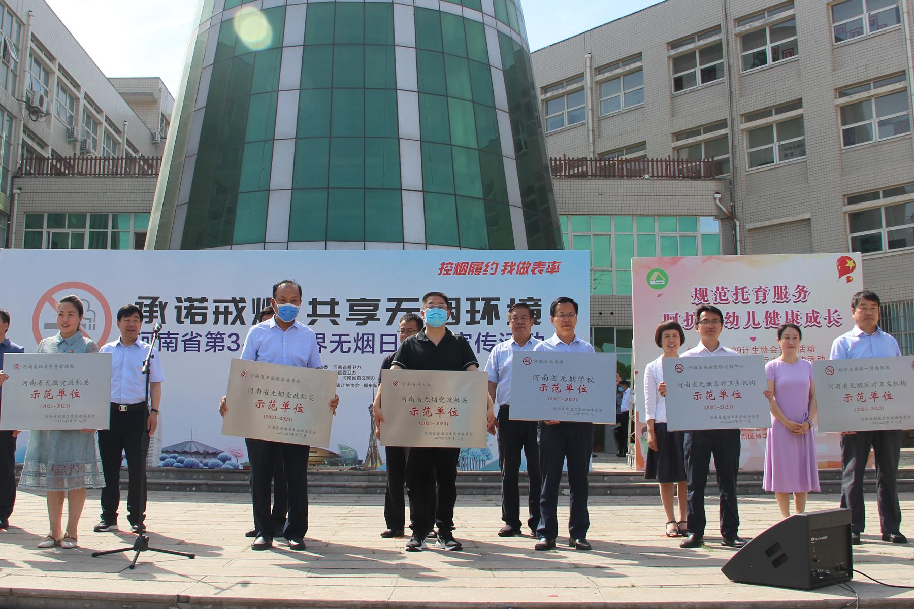 5月29日,在第34个世界无烟日即将到来之际,河南省卫生健康委、省爱卫办、省直机关工委、省直文明办、省事管局、省直爱卫办、省疾控中心、省计生协等联合举办了“承诺戒烟 共享无烟环境”主题宣传活动,深入贯彻《河南省爱国卫生条例》,积极推进健康中原行动控烟专项行动,动员全社会共同行动起来,共建共享无烟环境。在此次活动的启动仪式上,公布了20家无烟示范单位,我校名列其中,全省仅有2所乐鱼online(中国)入选。