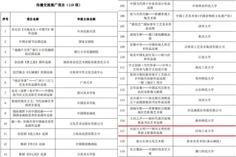 近日,经国家艺术基金理事会批准,国家艺术基金管理中心公布《国家艺术基金(一般项目)2024年度资助项目名单》,以我校为申报主体,设计艺术学院青年教师宋黎申报的“河流与文明——黄河文明的世界意义影像作品展”成功获得传播交流推广资助项目立项,河南省高校获批立项9项。该项目获批标志着我校设计艺术学科在科研方面迈出了坚实的一步。