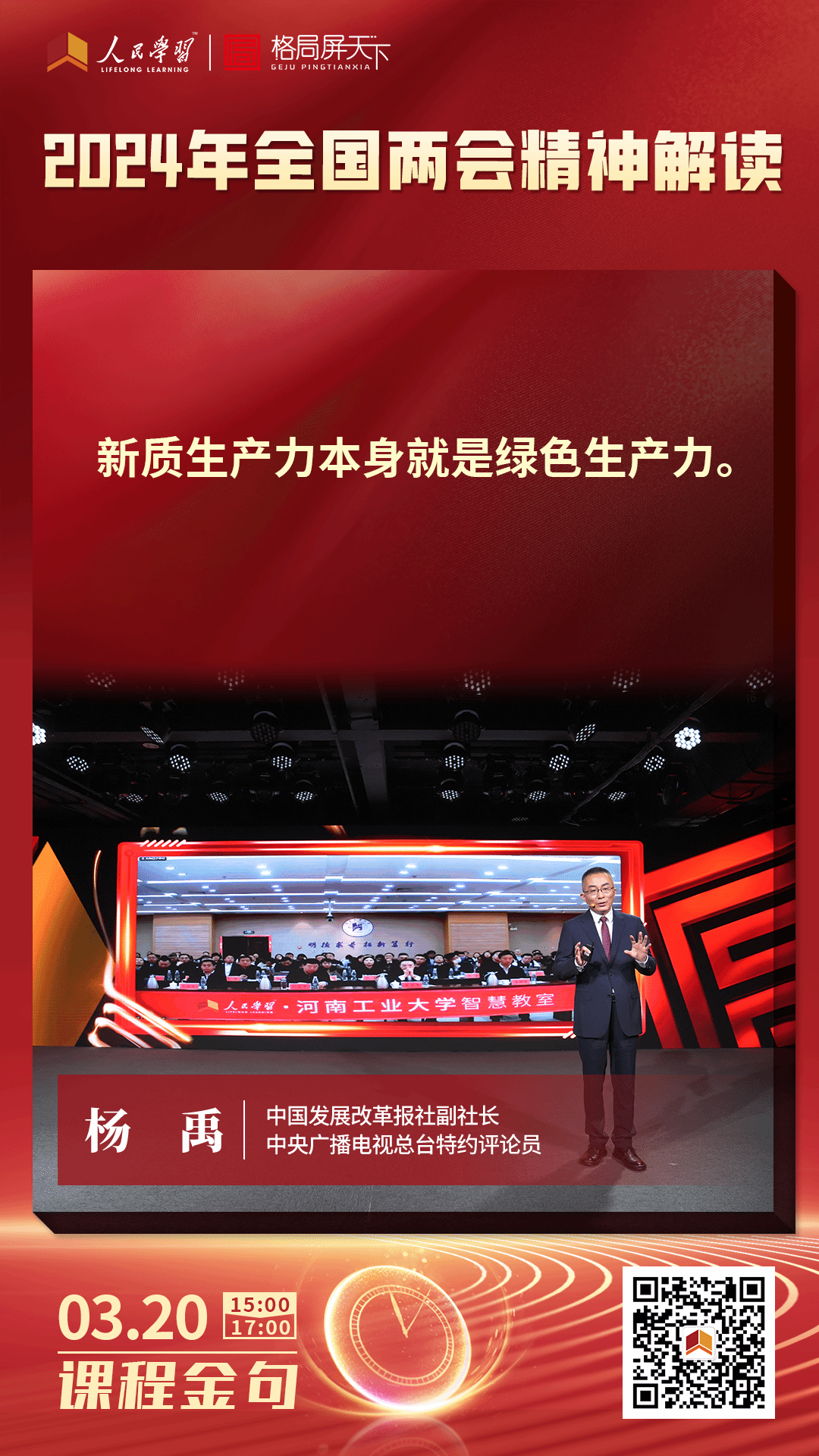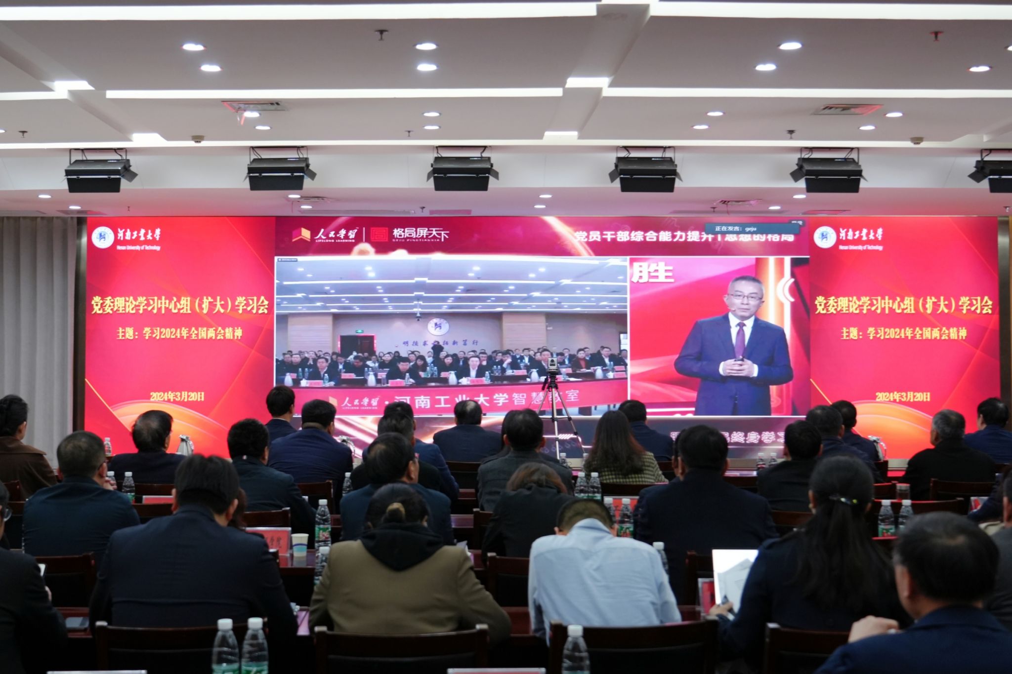在催人奋进的春天里,2024年全国两会完成各项议程,圆满落下帷幕。3月20日下午,校党委理论学习中心组在学术报告中心D205举行扩大会议,学习习近平总书记在全国两会期间重要讲话精神和全国两会精神,本次学习通过人民学习平台在线收听收看中国发展改革报社副社长、中央广播电视总台特约评论员杨禹主讲的“全国两会精神解读”专题报告。校领导、全体中层正职领导人员、思政课教师代表参加集中学习。