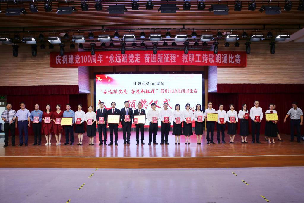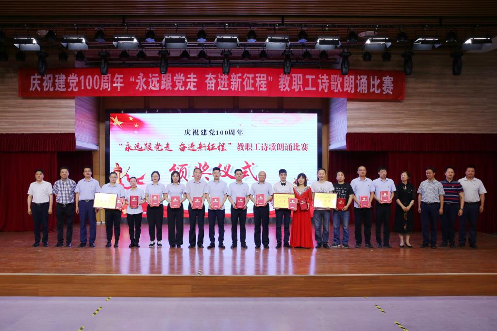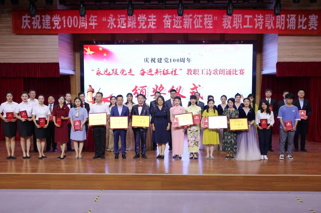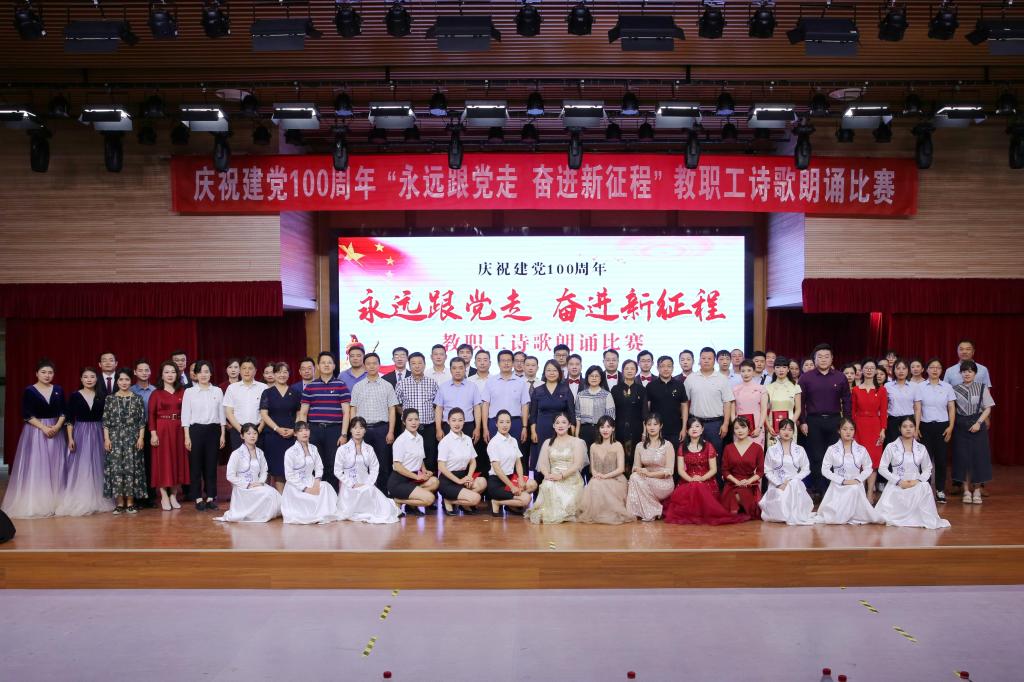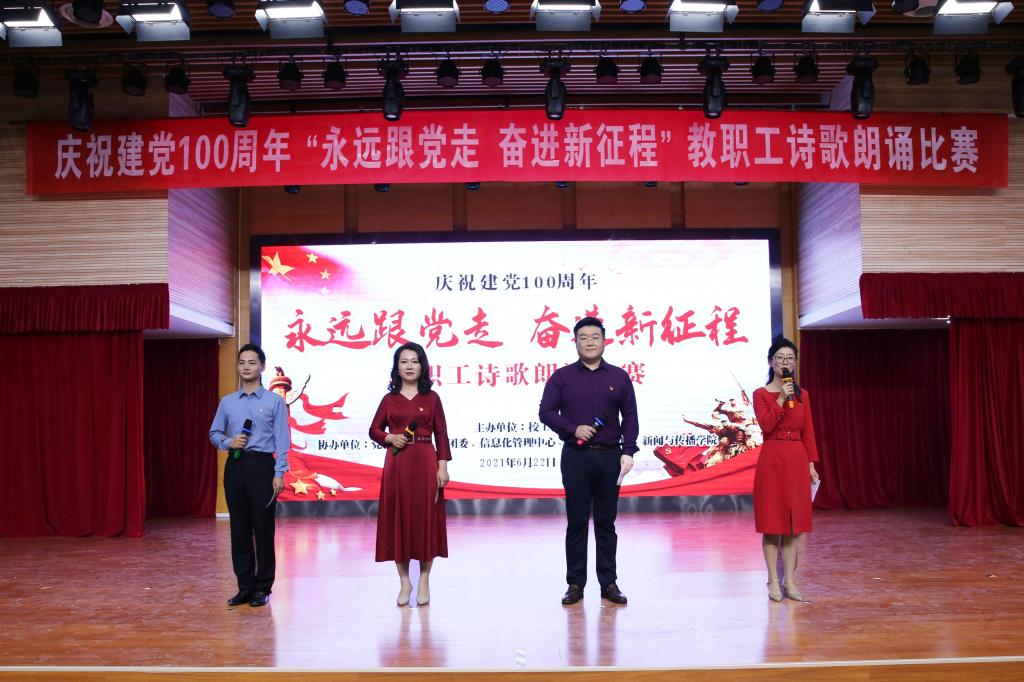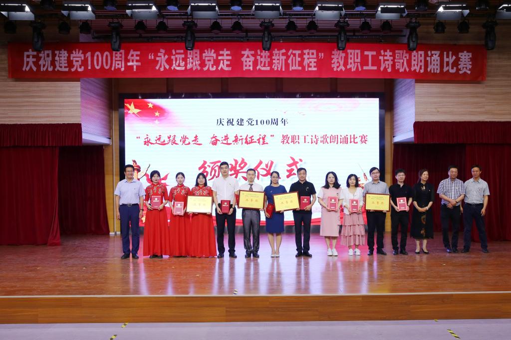 为庆祝中国共产党100周年华诞,回顾建党100年来取得的伟大成就,以实际行动深入学习贯彻习近平新时代中国特色社会主义思想和党的十九大以及十九届二中、三中、四中、五中全会精神,唱响爱党爱国主旋律,弘扬爱党、爱国、爱校精神,激发干事创业热情,凝聚推动乐鱼online(中国)发展的强大合力。6月22日下午,我校“永远跟党走 奋进新征程”教职工诗歌朗诵比赛隆重举行。副校长陈桂香、纪委书记周相寅出席了比赛。乐鱼online(中国)各相关部门负责同志和现场200多名教职工一同观看了比赛。