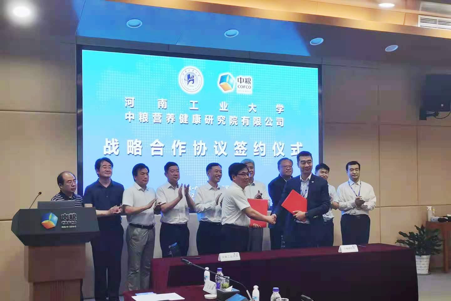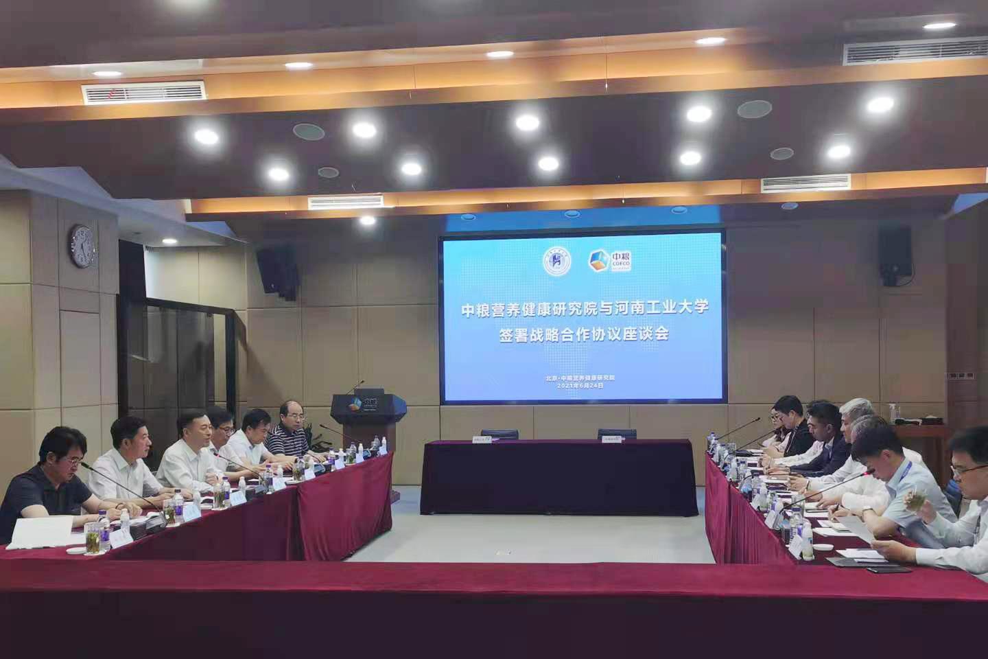 6月24日下午,我校与中粮营养健康研究院有限公司在北京签署战略合作协议。我校校长李成伟,副校长陈复生、李焕锋,中粮营养健康研究院党委书记、院长郝小明,中粮集团对外合作部总监陈刚,中粮营养健康研究院党委副书记、副院长孙天立,中粮营养健康研究院副院长王满意等出席签约仪式。签约仪式由中粮营养健康研究院副院长王满意主持。