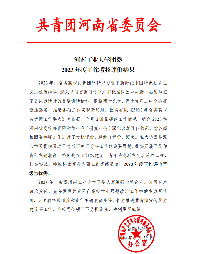 近日,共青团河南省委下发《河南工业大学团委2023年度工作考核评价结果》的函,对我校团委2023年度在团组织建设、青年马克思主义者培养工程、社会实践、挑战杯竞赛等方面的工作给予了高度评价,并宣布我校团委在全省2023年度高校共青团工作考核评价中获评“优秀”等级。