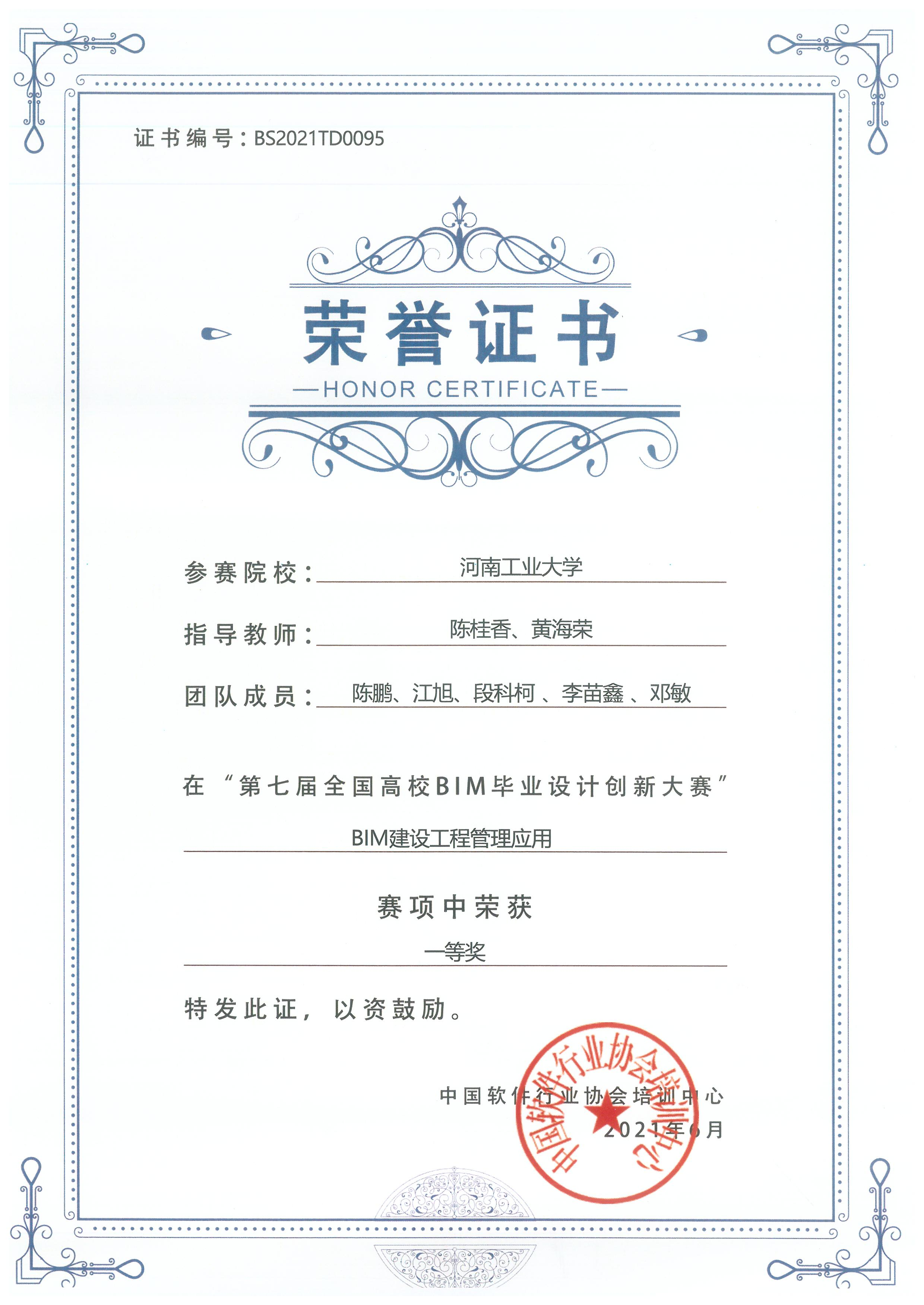 由我校副校长陈桂香、土木工程学院黄海荣老师指导,工程管理系陈鹏、江旭、段科柯、李苗鑫、邓敏5名同学组成的河工大BIM种子队经过6个月的准备,荣获了BIM建设工程管理应用模块全国一等奖。
