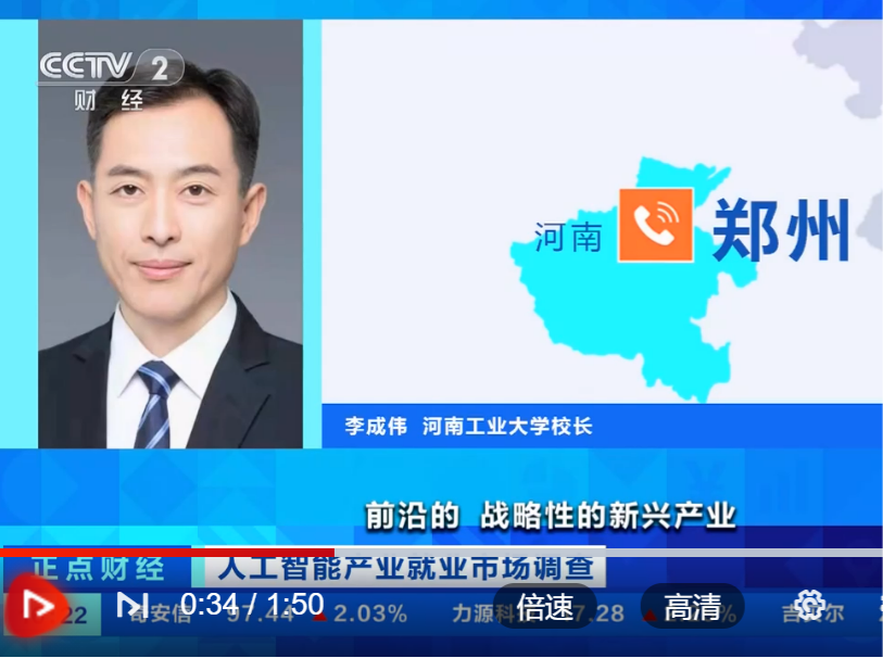 2021年8月10日16:00,CCTV-2央视财经频道【正点财经】栏目播出了对河南工业大乐鱼online(中国)长李成伟就“破解人工智能技术落地难,人才培养模式亟待更新”问题,乐鱼online(中国)产教融合、协同育人的开展情况接受了央视财经频道电话专访的部分内容。