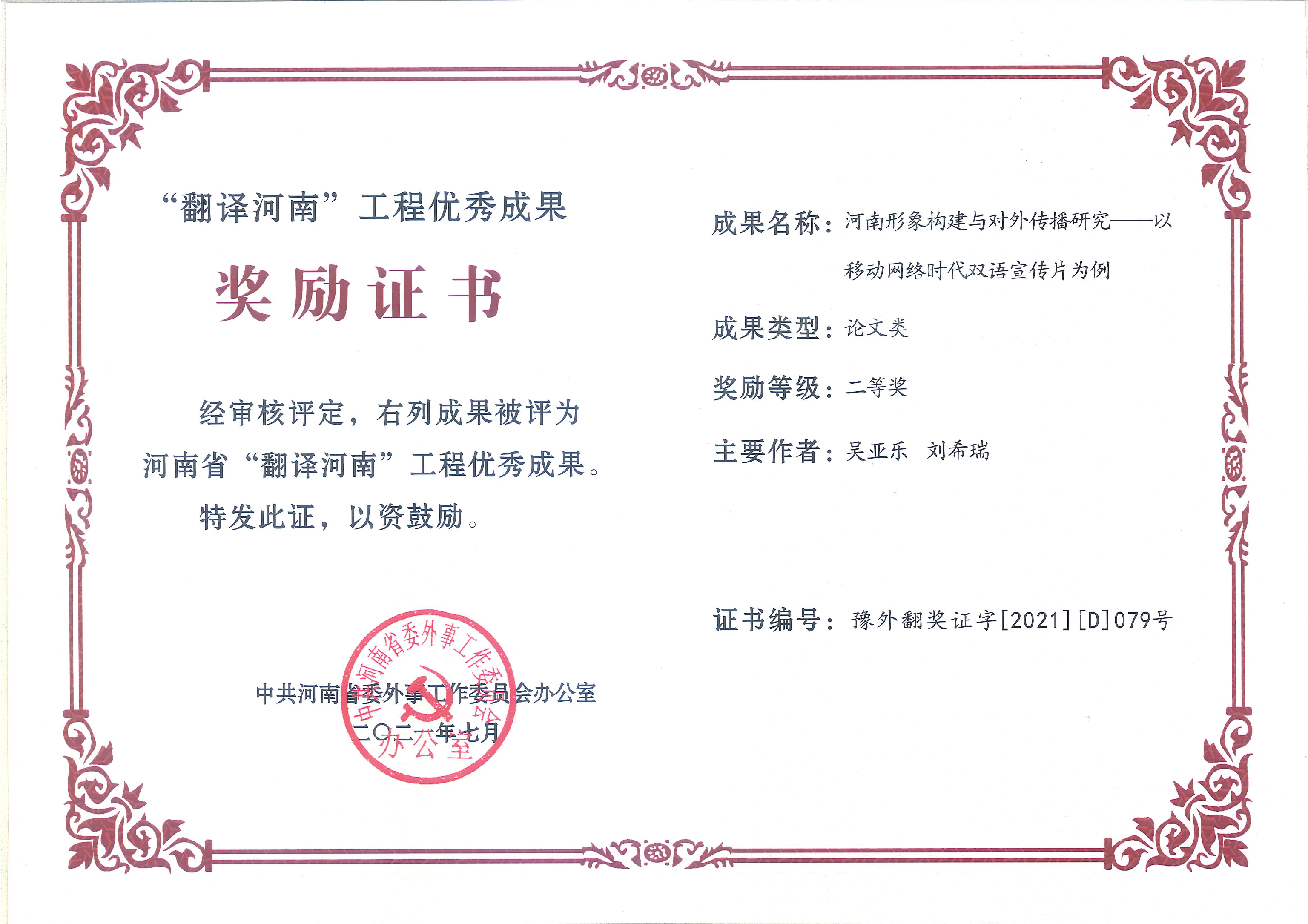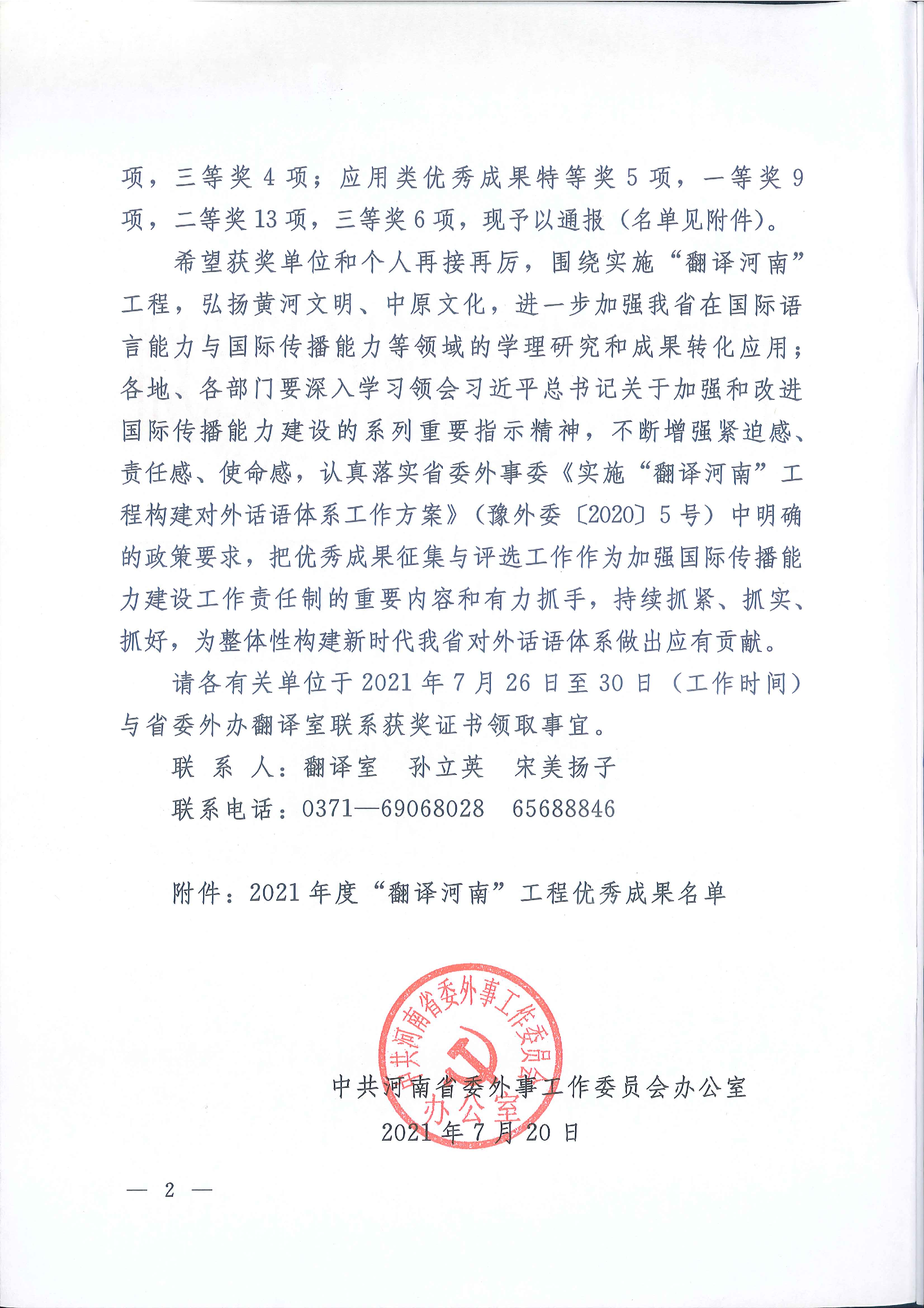此次在“翻译河南”工程优秀成果奖评选中斩获佳绩,展示了我校外国语言文学学科在中原文化国际传播、翻译理论与实践研究、语言服务等领域的学科特色和资源优势,为我校在中原文化传播过程中的社会形象起到一定积极的促进作用,为河南省对外翻译工作做出应有贡献。