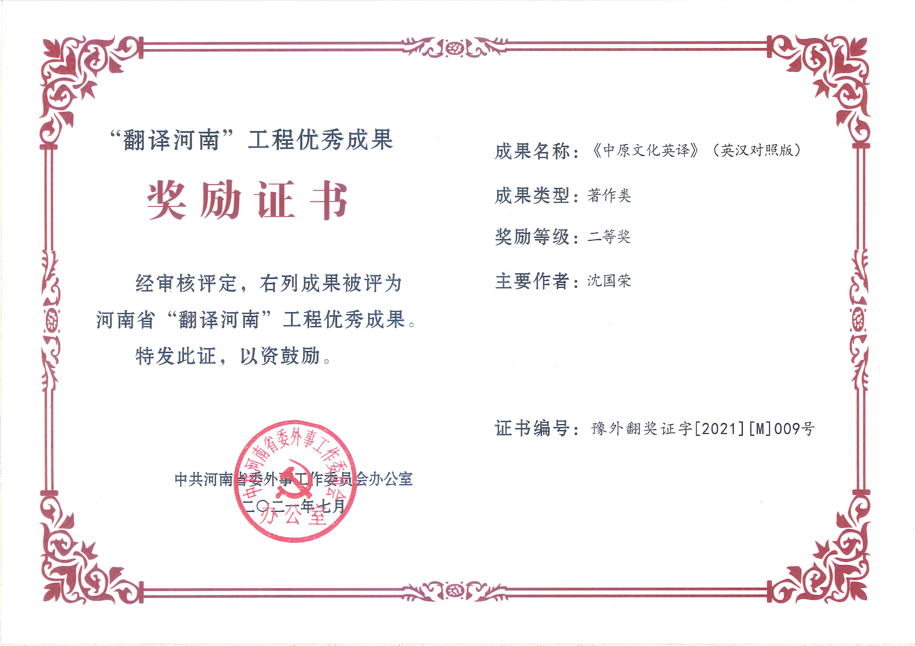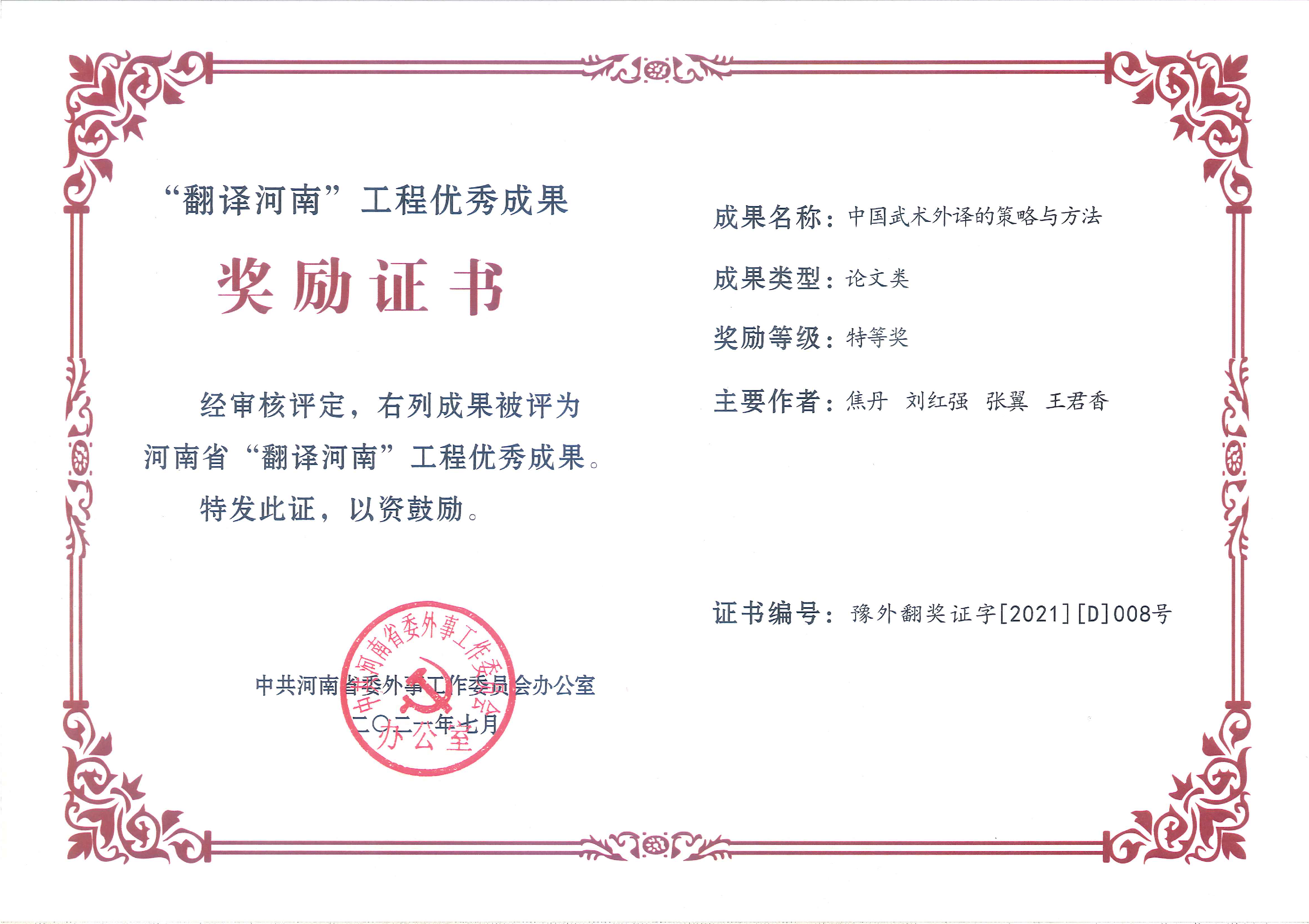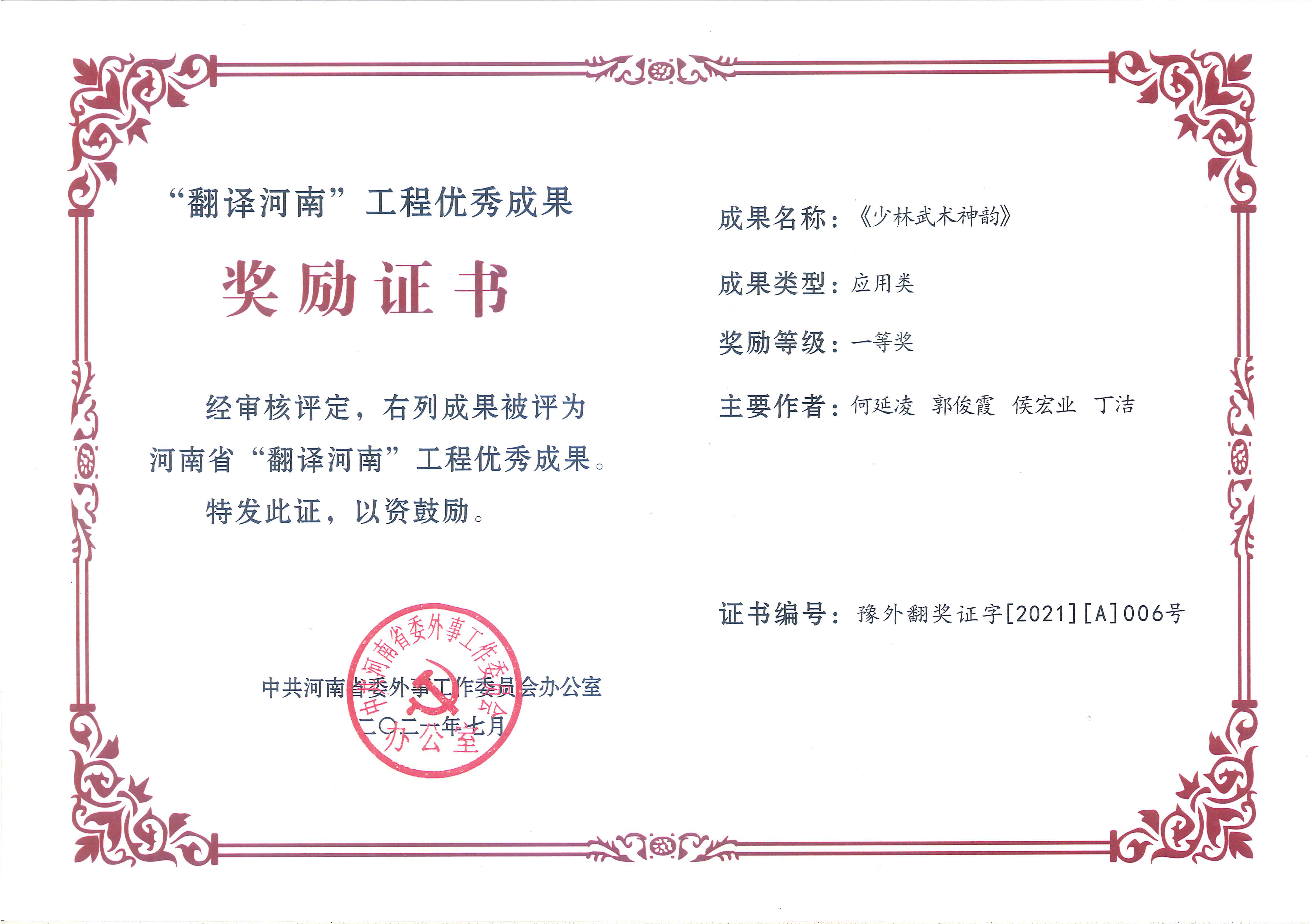 近日,中共河南省委外事工作委员会办公室下发《关于“翻译河南”工程优秀成果奖评选结果的通报》(豫外委办〔2021〕33号)文件,我校外语学院团队荣获特等奖2项、一等奖1项、二等奖3项。外语学院与登封市史志办编译的《<中华源·河南故事>中外文系列丛书(英汉对照版)》和焦丹老师的《中国武术外译的策略与方法》分获著作类和论文类特等奖,何延凌老师的《少林武术神韵》获应用类一等奖,沈国荣老师的《中原文化英译》获著作类二等奖,宁慧霞老师的The Fascinating Intellectuality Inherent in China Integrated System of Religious Doctrines Derived from Buddihism, Confucianism and Taoism和研究生吴亚乐同学与刘希瑞老师的《河南形象构建与对外传播研究˗以移动网络时代双语宣传片为例》获论文类二等奖。