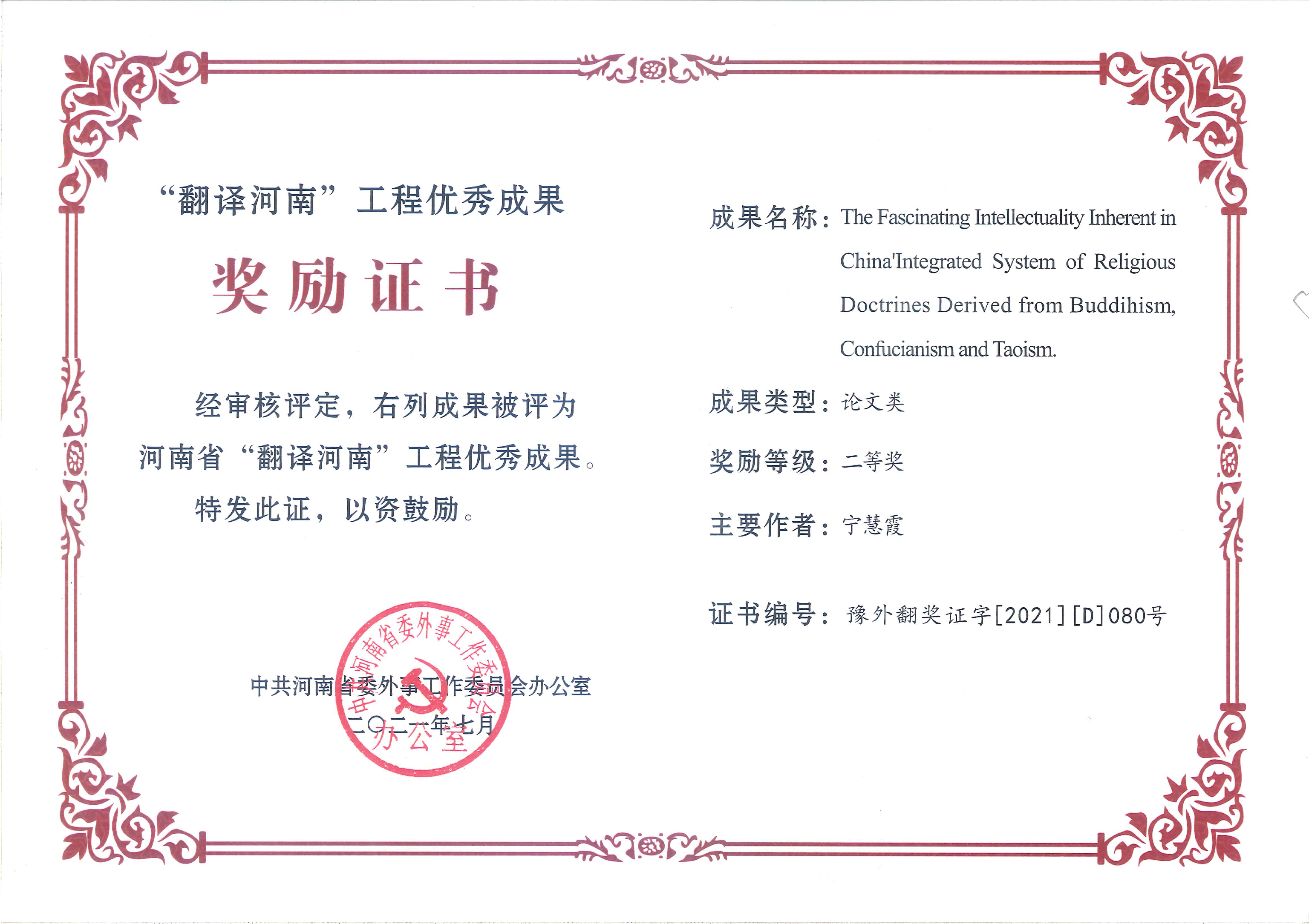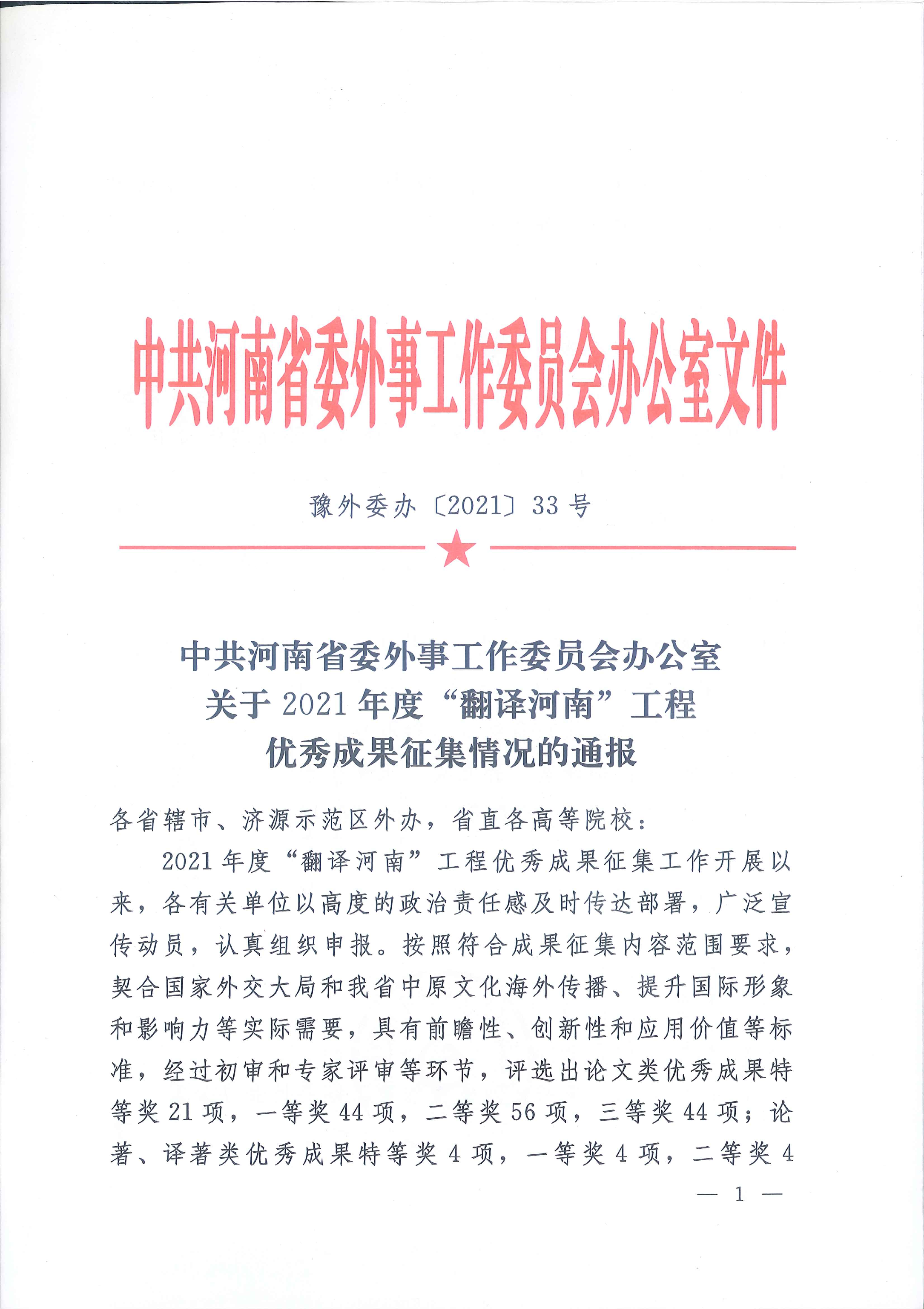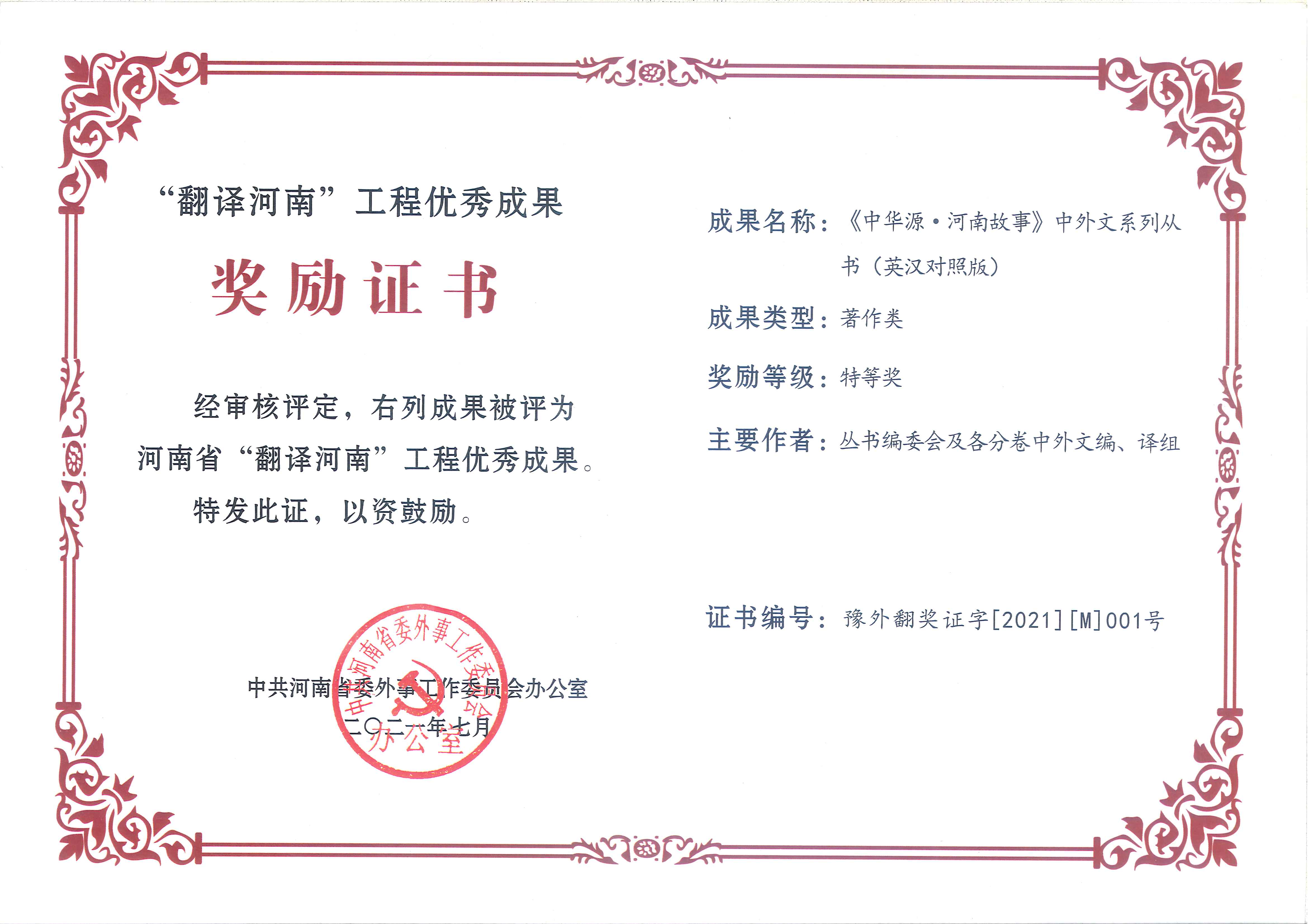 近日,中共河南省委外事工作委员会办公室下发《关于“翻译河南”工程优秀成果奖评选结果的通报》(豫外委办〔2021〕33号)文件,我校外语学院团队荣获特等奖2项、一等奖1项、二等奖3项。外语学院与登封市史志办编译的《<中华源·河南故事>中外文系列丛书(英汉对照版)》和焦丹老师的《中国武术外译的策略与方法》分获著作类和论文类特等奖,何延凌老师的《少林武术神韵》获应用类一等奖,沈国荣老师的《中原文化英译》获著作类二等奖,宁慧霞老师的The Fascinating Intellectuality Inherent in China Integrated System of Religious Doctrines Derived from Buddihism, Confucianism and Taoism和研究生吴亚乐同学与刘希瑞老师的《河南形象构建与对外传播研究˗以移动网络时代双语宣传片为例》获论文类二等奖。