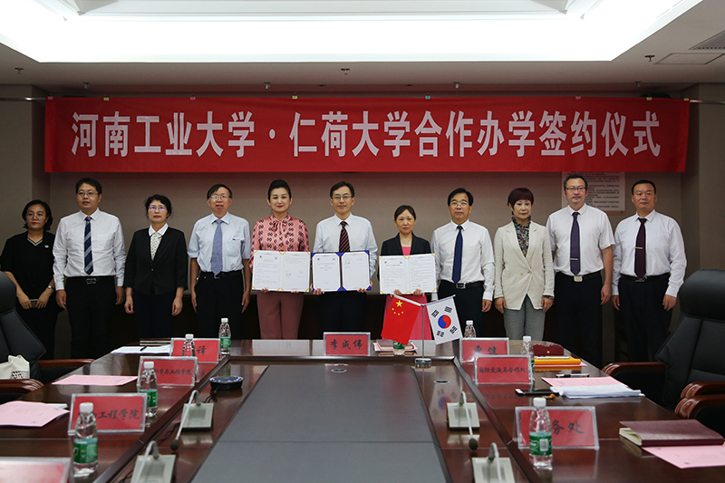 李成伟、赵明寓分别代表河南工业大学、仁荷大学签署了《中国河南工业大学与韩国仁荷大学合作举办河南工业大学仁荷国际学院协议书》《河南工业大学仁荷国际学院章程》《中国河南工业大学—韩国仁荷大学关于共建韩语教育中心合作协议书》,并合影留念。签约仪式在热情、友好的氛围中落下帷幕。
