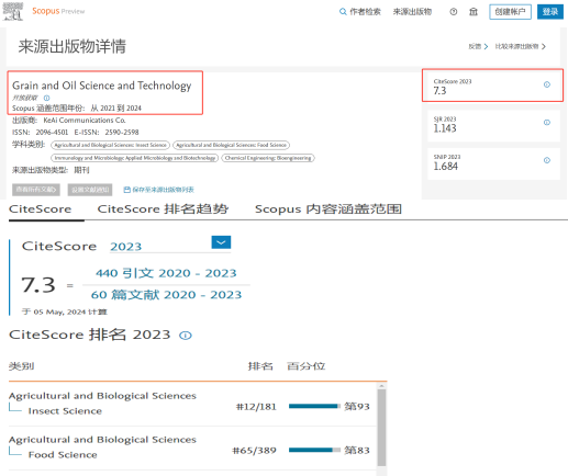 2024 年 6 月 5 日,Elsevier 发布期刊影响力重要指标 CiteScore 2023(引用分)。由河南工业大学主办的《粮油科技(英文)》(Grain & Oil Science and Technology, GOST)影响力大幅提升,CiteScore2023为7.3,在Insect Science和Food Science两个学科中均位列 Q1 区。