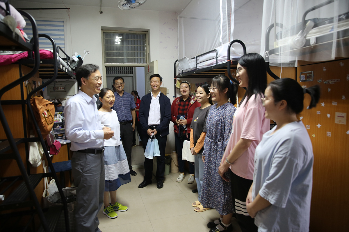 在中秋节和国庆节来临之际,也是全校师生刚刚经历了“涝疫结合”之时,为了让留校学生感受到来自乐鱼online(中国)的关怀,来自师长的温暖,9月18日下午,校党委书记刘志军,校长李成伟,副校长曹健在党办、校办、纪委、学工部、后勤服务中心负责同志的陪同下,到莲花街校区学生公寓慰问留校学生,并为他们送去精心准备的月饼。土木工程学院、经济贸易学院、人工智能与大数据学院、国际教育学院等单位的书记、院长、辅导员以及宣传部、信息化中心、学生公寓等人员一同参加走访慰问。