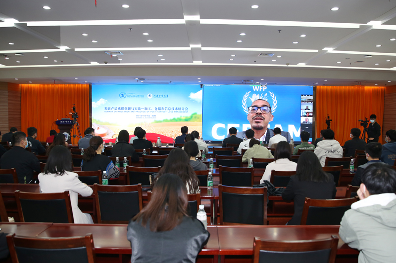研讨会由我校粮油食品学院赵仁勇教授与联合国世界粮食计划署代表联合主持,赵仁勇教授、王凤成教授、王殿轩教授分别在粮食加工减损技术与粮食仓储减损技术讨论环节,就“粮食加工与减损”、“ 粮食加工设备”和“ 中国粮食仓储技术”做主题发言;国家粮食和物资储备局王世海主任、北京工业大学臧传真教授、加纳商品交易所理查德先生分别就“粮食储备与应急管理”、“ 区块链技术在粮食供应链中的应用”和“非洲粮食产业信息化前景”做主题发言,并现场解答线上、线下与会代表提出的问题,与来自各国际组织、非洲各国代表共同为粮食产后各环节面临的相关问题谋求有效的解决途径。会后,河南工业大学将与联合国世界粮食计划署紧密围绕南南合作,开展促进粮食产后减损增效的国际合作和技术对接。