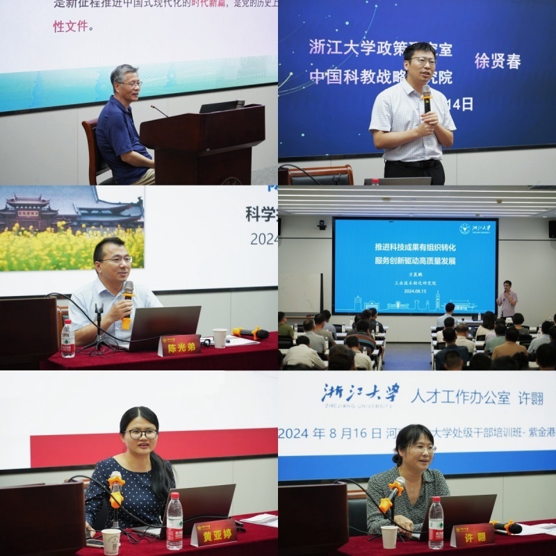 培训期间,浙江外国语学院党委书记宣勇以《党的创新理论推动向一流高水平大学转型发展的思考与实践》为题,浙江大学政策研究室主任兼党办校办副主任、中国科教战略研究院副院长徐贤春以《一流学科群建设探索与发展规划》为题,浙江大学基础交叉研究院副院长陈光弟以《高校科研发展研究与创新实践》为题,浙江大学工业技术转化研究院产学研合作部副主任兼成果转化项目服务部主任方晨鹏以《推进科技成果有组织转化服务创新驱动高质量发展》为题,浙江大乐鱼online(中国)长办公室副主任、教育学院百人计划研究员黄亚婷以《高校教育评价机制与改革路径探索》为题,浙江大学人才工作办公室主任、人力资源处副处长(兼)、党委组织部副部长(兼)许翾以《教育强国建设背景下的人才引进与人才管理体系建设》为题进行6场专题讲座。培训同时组织全体学员赴浙江诸暨枫桥镇重温“枫桥经验”起源和发展,进一步体悟习近平总书记重要指示批示精神;赴嘉兴南湖革命纪念馆进行现场教学,重温入党誓词,感悟红船精神,增强理想信念与党性修养;实地考察浙江大学紫金港科创小镇,解剖产教融合与校企合作实际案例,汲取校企双融先进经验;参观学习浙江大学艺术与考古博物馆,深切感受浙大文化、精神的传承与创新。