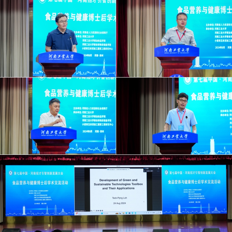 特邀报告环节由河南农业大学食品科学技术学院院长黄现青、郑州轻工业大学食品与生物工程学院院长张华主持;新加坡国家科学院院士、河南工业大学罗德平教授,国家重大人才工程计划项目特聘教授、天津科技大学王书军教授,南京农业大学食品科技学院副院长李伟教授,中国农业科学院农产品加工研究所佟立涛研究员,河南农业大学食品科学技术学院院长黄现青教授分别围绕“未来食品”“绿色食品加工”“食品安全”和“食品营养与健康”等主题做了学术报告。